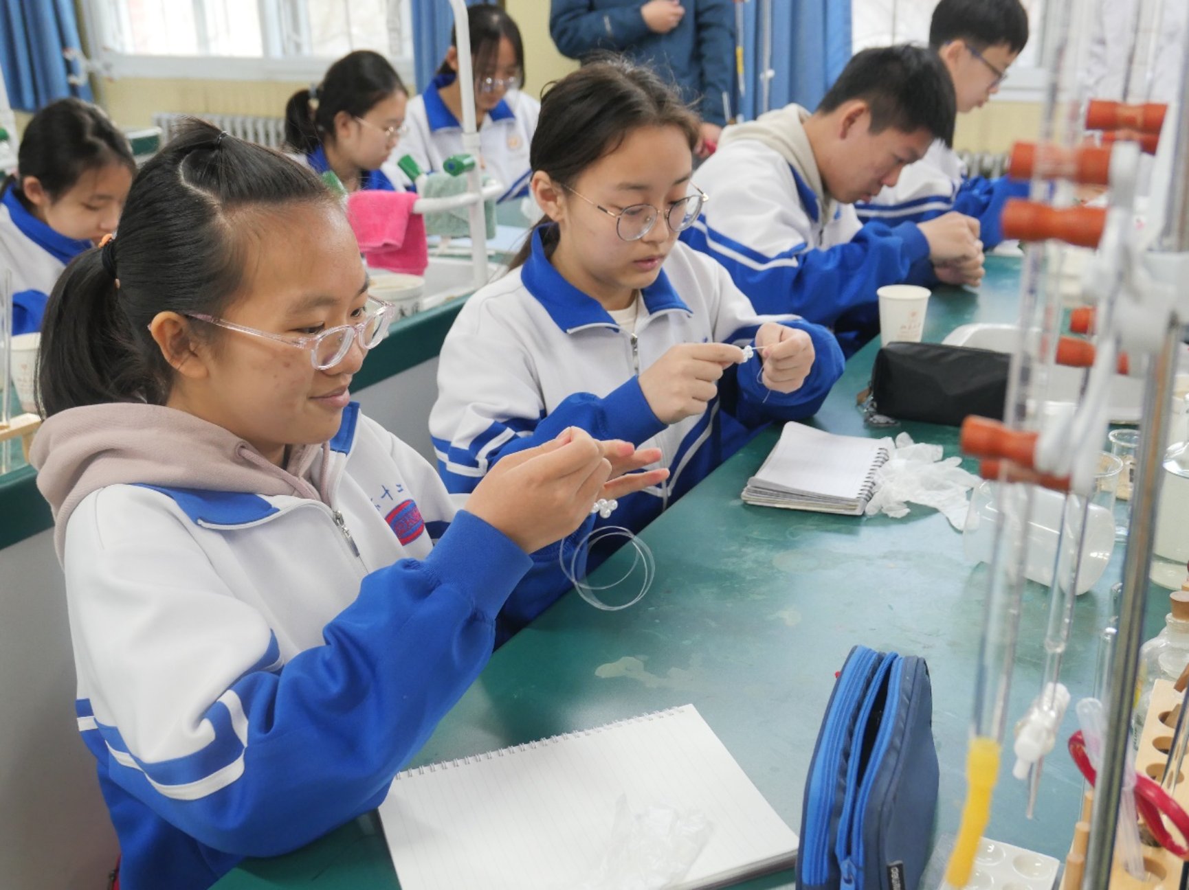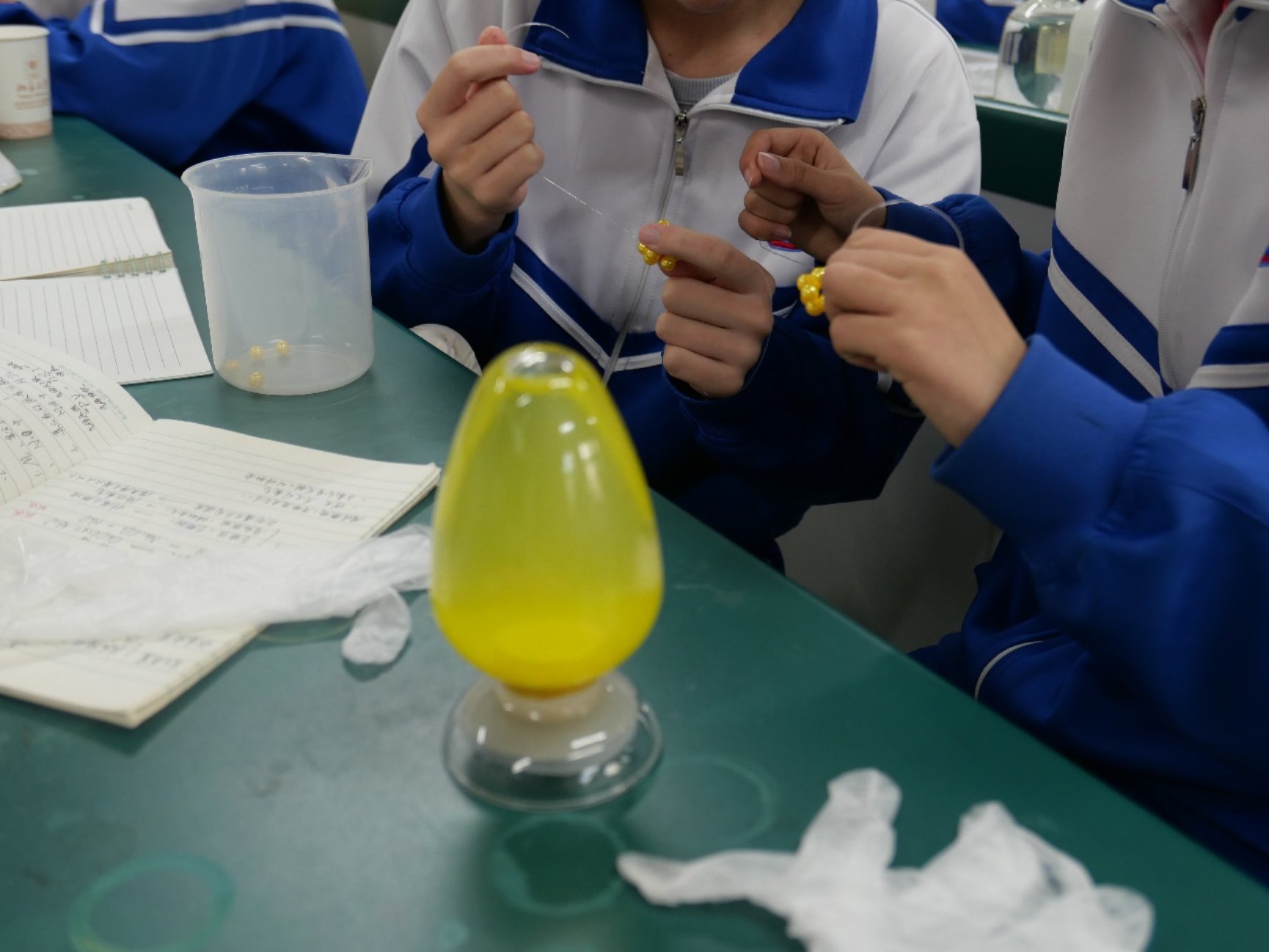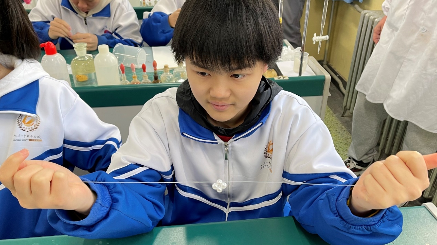 在演示实验充分激发了同学们的兴趣之后,便进入到了亲自动手做实验的环节。在志愿者胡奕杰、王尉嘉、毕诚奥、袁昊、刘晓宇的讲授下,同学们通过“串珠实验”亲手编织出由“原子”构造的氯化钠的晶体结构,进一步观察原子的不同的堆积形式;通过“银镜反应”在热水中看见银的生成,进一步理解书本上化学反应方程对应的现象;通过“纸张书写魔术”分析什么类别的化学物质会发生化学反应,验证了自己的猜想;通过亲手提取花青素,初步了解酸和碱的概念;通过“酸碱滴定”实验进一步明确如何定量测量溶液的酸性和碱性。通过化学互动实验,同学们更加深入理解了化学原理和实验操作方法。