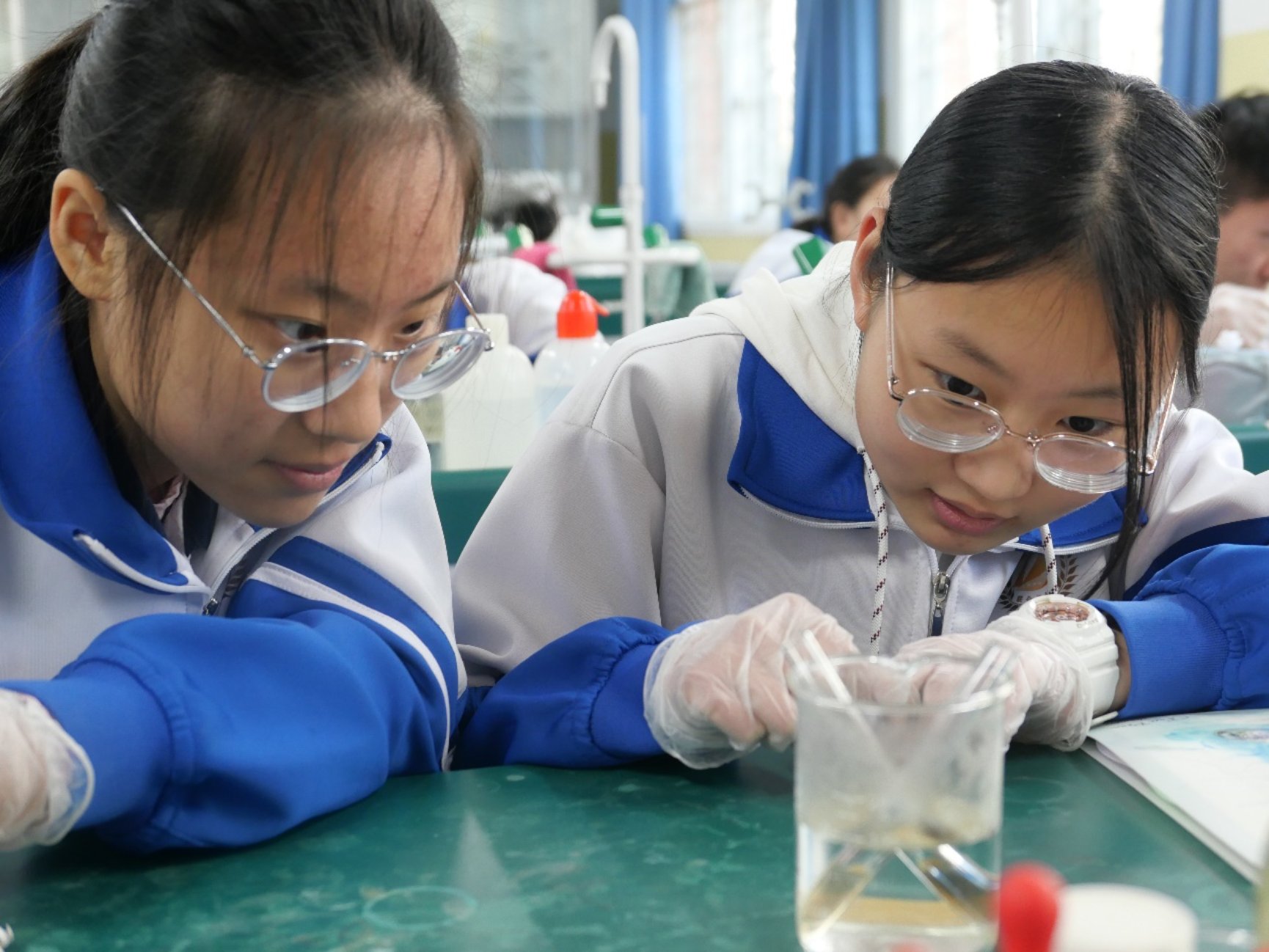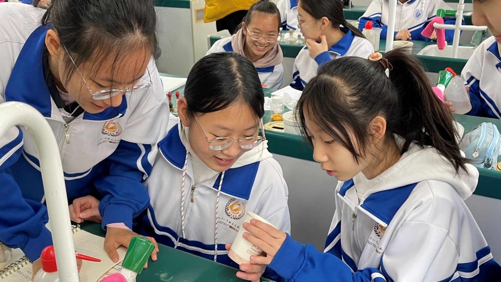 实验结束后,党支部志愿者与初中生展开讨论交流。同学们进一步针对实验过程中发现的问题进行了提问,志愿者们也对其进行了深入浅出的解答,现场氛围十分活跃。同学们纷纷表示通过实践课程,更加细致的了解了化学反应的全过程,对学到的知识有了更深的体会。