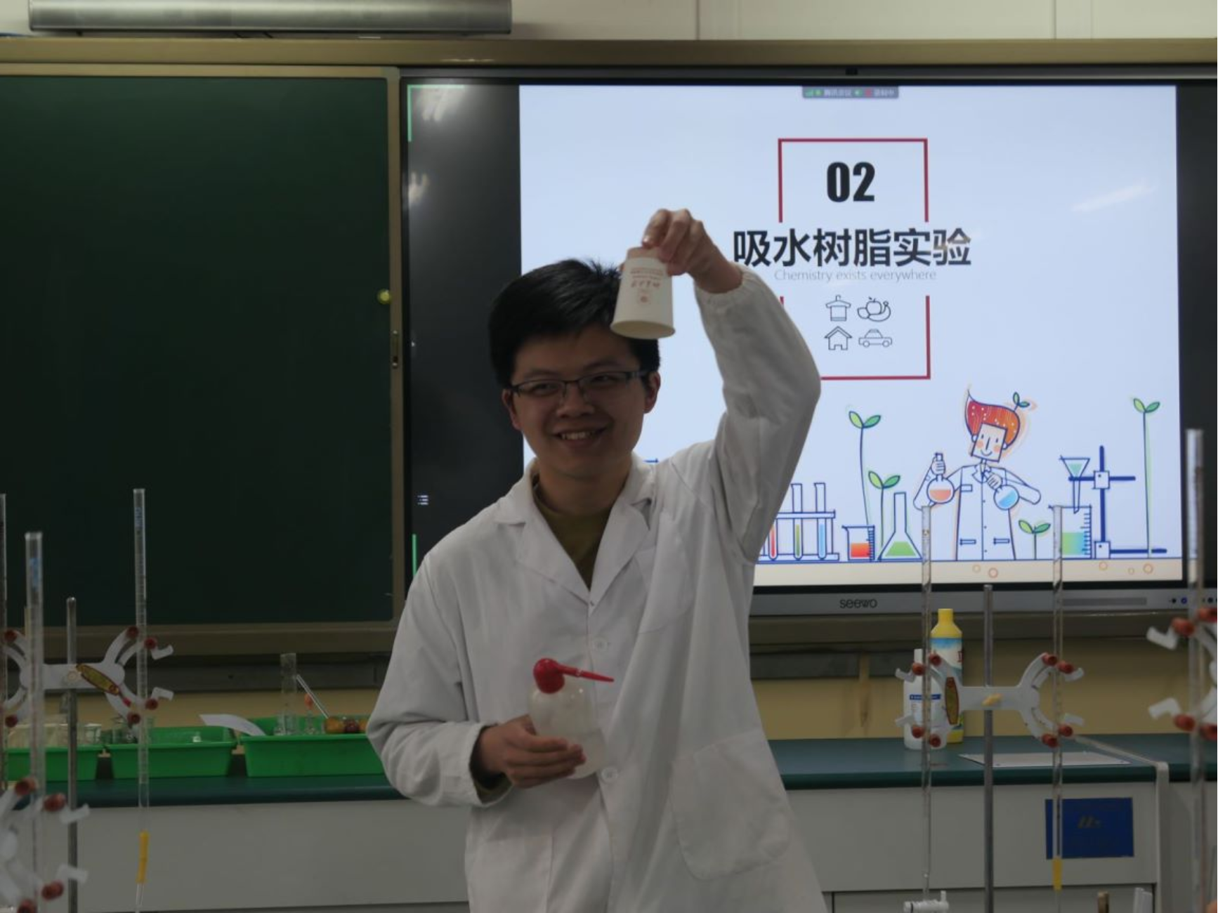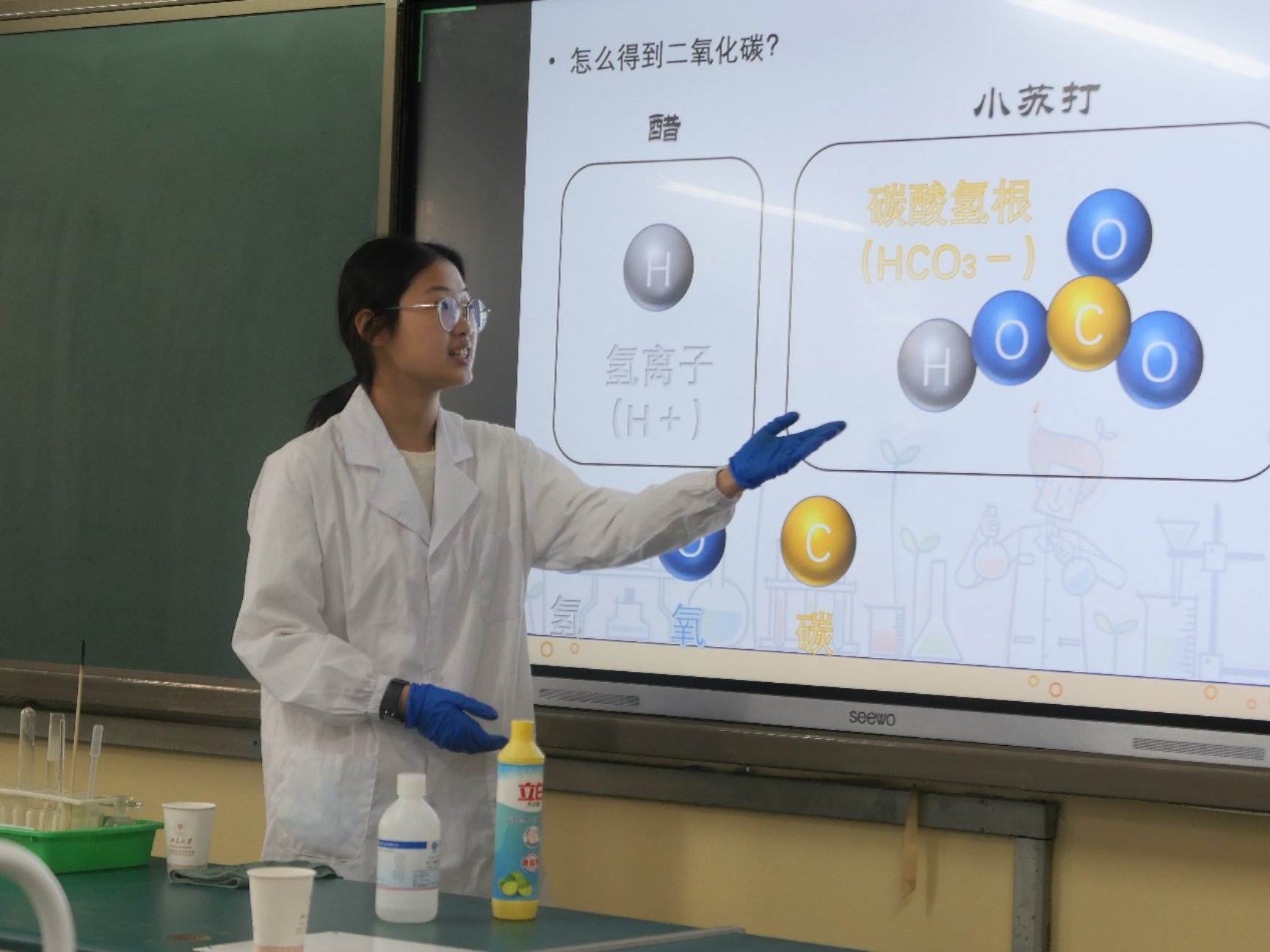 结构决定性质,不同的化学结构将带来不一样的化学现象,佘新辰给同学们带来了一个神奇的吸水魔术——滴入纸杯的水竟然消失不见了!在同学们的追问下,佘新辰解释到,这是因为杯中预先放置了吸水树脂,而它的网状交联结构可以吸收大量的水。接着,廖博雅用厨房中常见的物质——白醋和小苏打向同学们演示了二氧化碳的制备,从原子层面上解释了CO2气体的形成过程。