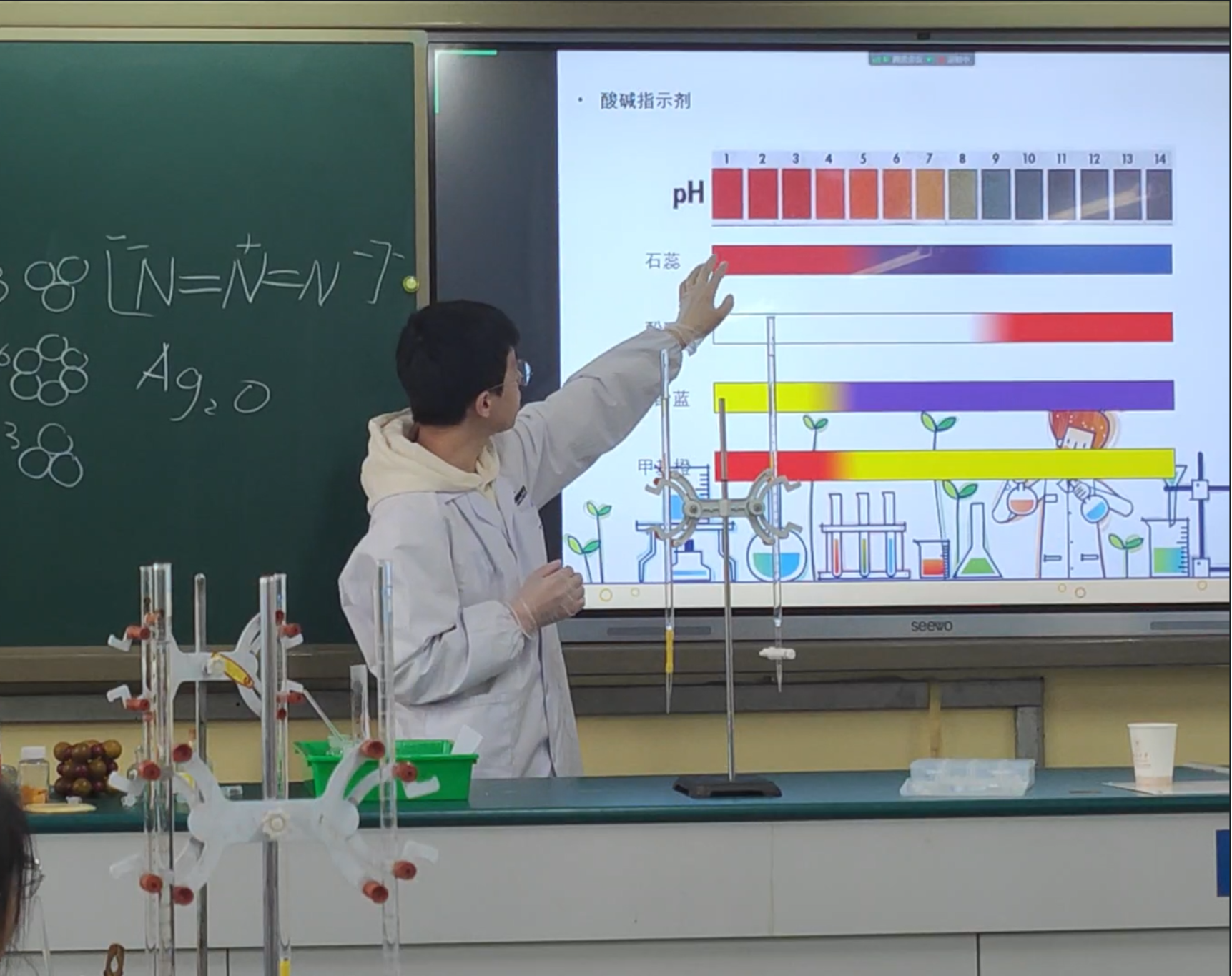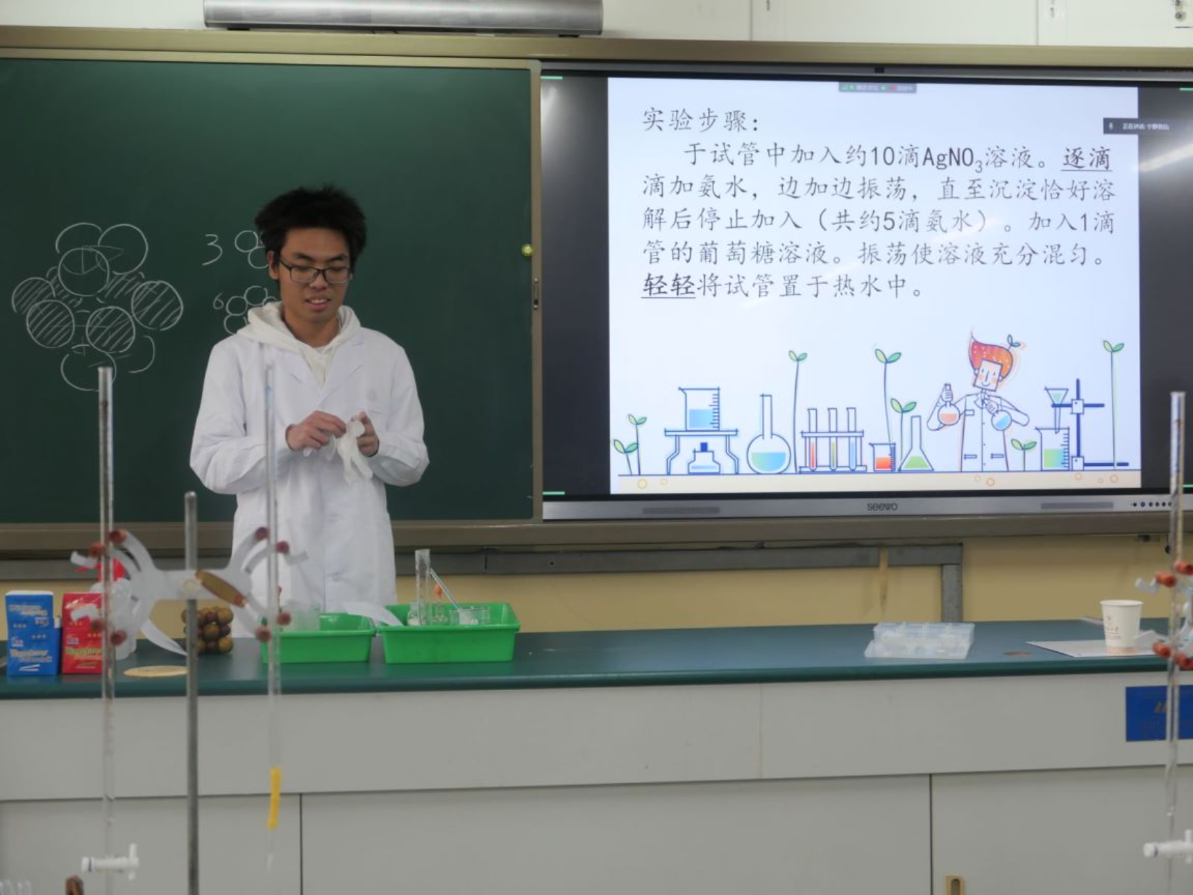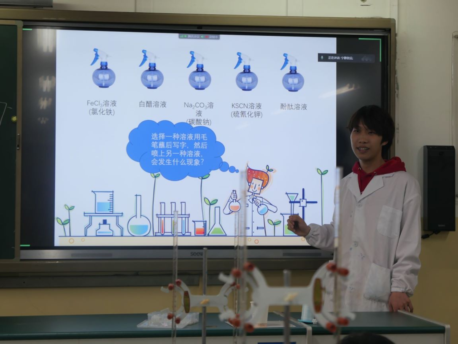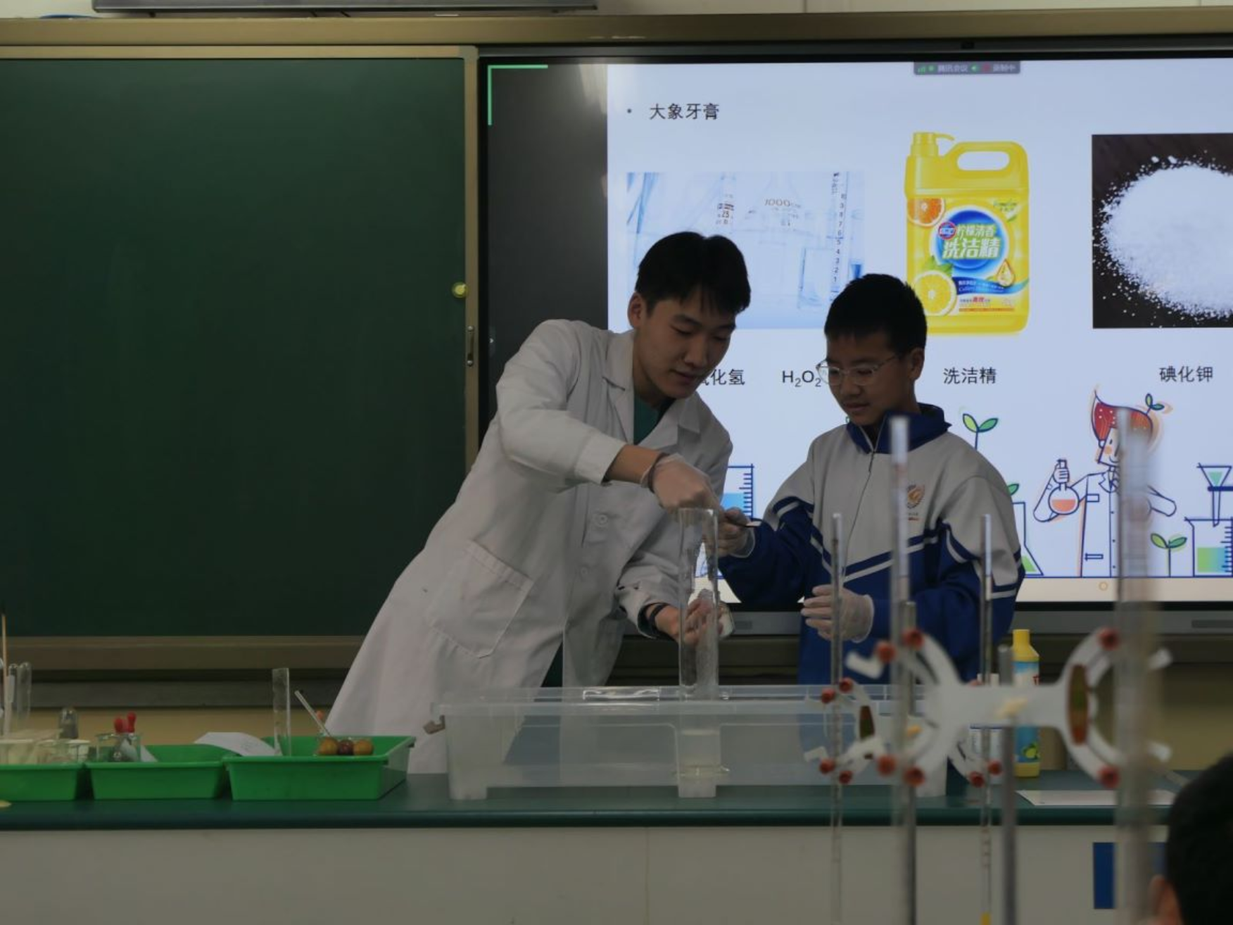 上午8:35,化学实验课堂正式开始。本次活动的化学实验主要分为演示实验和互动实验两个部分。志愿者们挑选了“大象牙膏”“吸水魔术”“厨房实验”“银镜反应”“纸张书写魔术”“滴定实验”“指示剂变色”等兼具趣味性和可行性的实验,通过生动、形象、实践性强的教学方式,使同学们更好地了解化学学科知识,增加对化学科学的兴趣和探究热情。