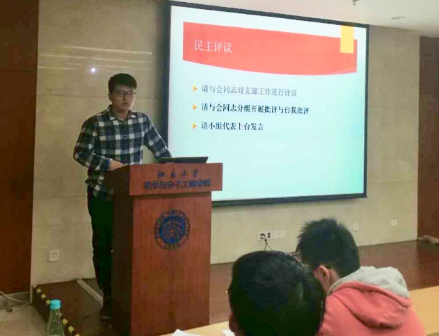 会议伊始,党支部书记高智悦同志首先介绍党支部的五个职责,并总结了自党支部成立以来举办的各项活动,包括选举产生支部委员,走访卢沟桥及抗日战争纪念馆,深入学习党的十九大会议精神及北大第十三次党代会精神,集体观看第十三届全国人民代表大会第一次会议等。回顾过往的党务工作活动,结合自身要求和党务工作中的不足,高智悦书记带头开展批评和自我批评。她提出支部活动内容不够丰富、精品,党建制度规范化不够,党员同志们理论学习应该更加常态化,党费管理松懈等四个问题。