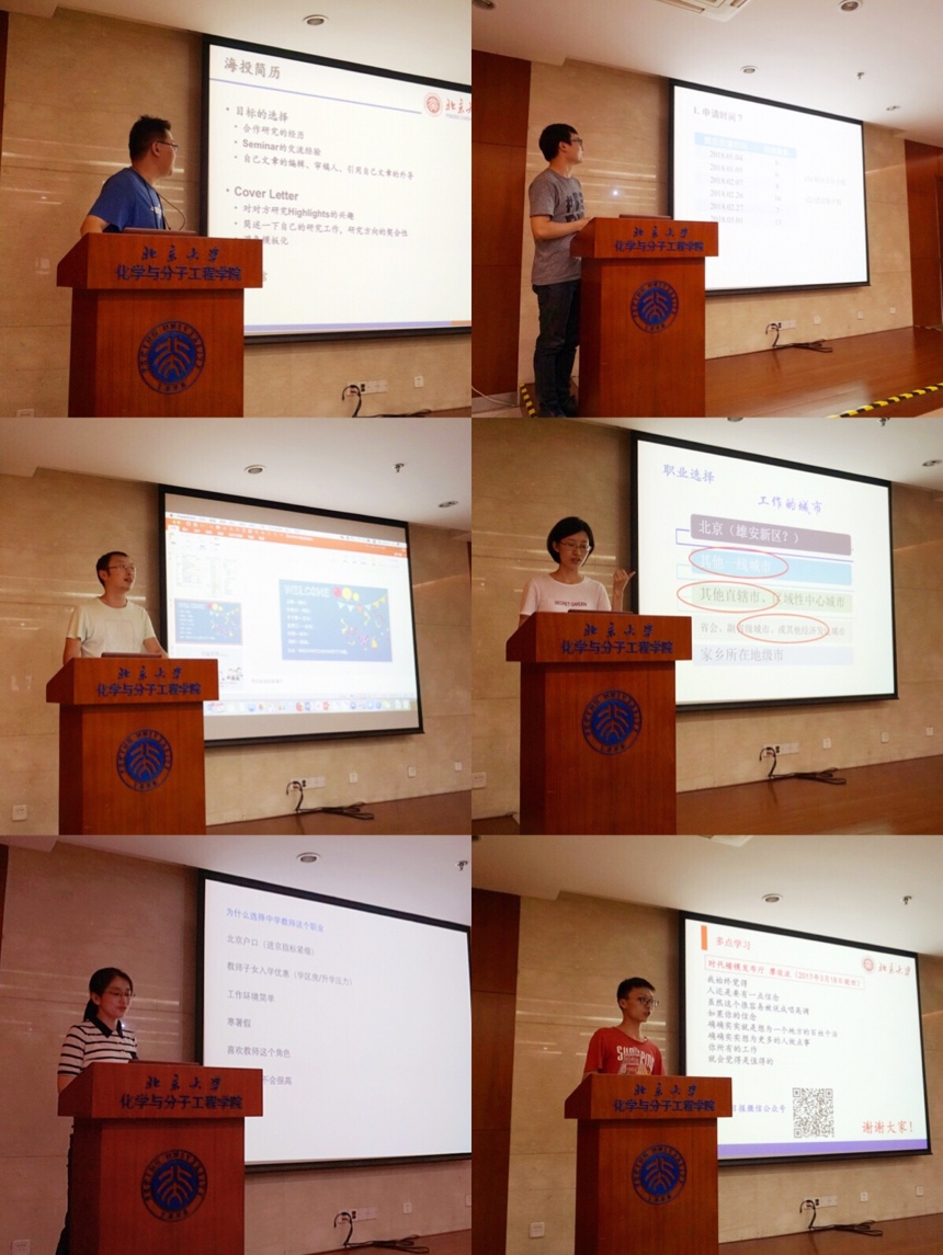 首先是选择继续从事学术道路的王腾与叶森云同学来为大家讲解申请博后过程中需要注意的事项。其中王腾同学认为,在申请博后之前,最好能参加一些学术交流项目,以增加对方对你的理解程度;叶森云同学则建议大家要尽早申请博后,最好能在研五上学期就开始大量投递简历,以提高命中率。选择在就职企业的赵秀兰与王宇豪同学则分享了很多就职技巧以及如何正确对待求职过程中心态的变化。时朔同学则通过具体分析来解释为何目前高中是很多同学的转行就业选择;周胜同学分析讲解各地的引进生政策,并认为有“情怀”才能成为一名真正做实事的选调生。