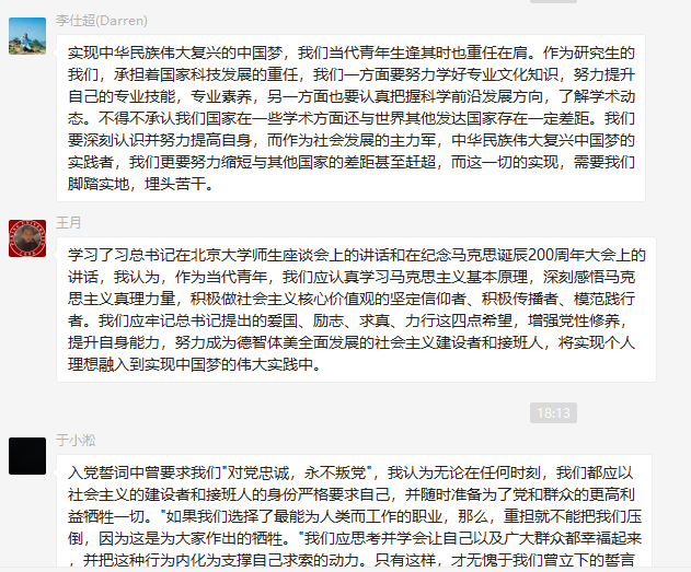 在“五四”青年节和北京大学建校120周年校庆日即将来临之际,习近平总书记来到北京大学考察并在与北大师生座谈时发表了重要讲话,在全校师生中引起了强烈反响,振奋着每一名北大青年学子的心。为了学习习总书记的讲话精神,牢记青年应扛起的历史使命和时代责任,2016级研究生支部成员于5月24日自觉组织学习小组进行交流学习。