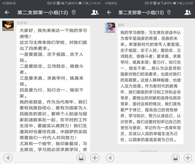 “习主席在讲话中认为青年是国家的希望、民族的未来。希望新时代的青年人要爱国,忠于祖国,忠于人民;要励志,立鸿鹄志,做奋斗者……我认为这是党和国家对我们的高要求,也是对我们的高期望。这使人精神振奋,也使人压力倍增。作为新时代的新青年,我们首先要严于律己,提高自己的党性修养,学习知识,我们还要时刻牢记自己的责任与使命,牢记作为一名青年党员,应该以人民的幸福生活为己任,以国家的富强发展为己任。”胡杨同学说。