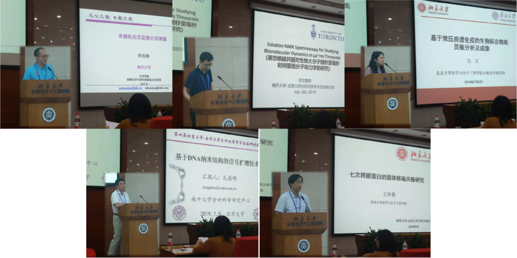 开幕式后,开始正式的学术交流。6日下午的研讨会分别由邵学广教授和邵元华教授先后主持,共有五位老师受邀作了报告,分别为来自南开大学的肖乐辉老师(报告题目“单颗粒光学显微化学测量”)、孔德明老师(报告题目“基于DNA纳米结构的信号扩增技术”)和来自北京大学的白玉老师(报告题目“基于质谱免疫方法的生物标志物超灵敏分析与成像”)和王申林老师(报告题目“七次跨膜蛋白的固体核磁共振研究”)以及来自多伦多大学的宇文泰然博士(报告题目“液体核磁共振对生物大分子微妙至毫秒时间量级分子动力学研究”)。