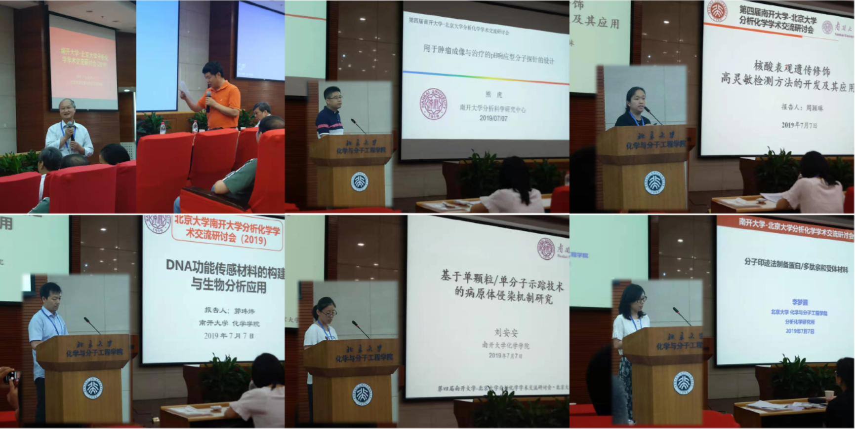7月7日上午,研讨会继续。南开大学的庞代文教授和北京大学的张新祥教授先后主持了研讨会,共有五个受邀报告,分别为来自南开大学熊虎老师的“用于肿瘤成像与治疗的pH响应性分子探针的设计”、郭玮炜老师的“功能核酸材料在生化分析中的应用”和刘安安老师的“基于单颗粒/单分子示踪技术的病原体侵染机制研究”以及来自北京大学周颖琳老师的“核酸表观遗传修饰高灵敏检测方法的开发及其应用”和李梦圆老师的“分子印迹制备蛋白/多肽亲和受体材料”。参会师生对各个报告都进行了热烈的讨论。