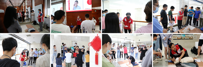 随后,师生们分组进行实际操作。八位老师利用心肺复苏人体模型向师生们展示了完整的心肺复苏操作流程,师生们在红十字会讲师们的指导下依次练习,并通过了实际操作的考核。