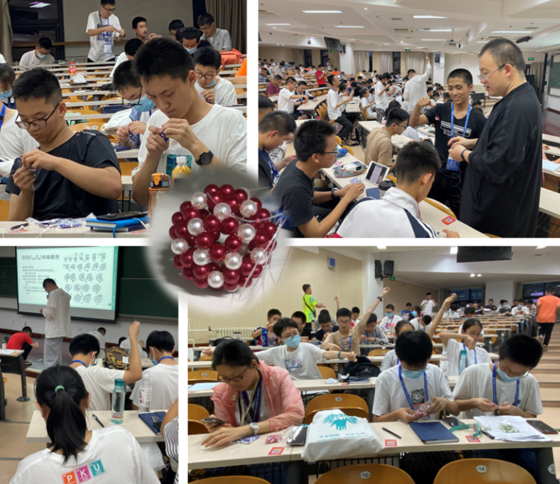 暑期课堂还为同学们安排了趣味盎然的科普互动环节。在马锴果老师简要介绍分子结构与串珠模型的科普知识后,同学们在实验教学中心各位老师的指导下,兴味盎然自己动手进行串珠实践。一个个完整漂亮的C60模型从营员的巧手中串出,同学们兴奋而自豪地相互展示着自己的作品。