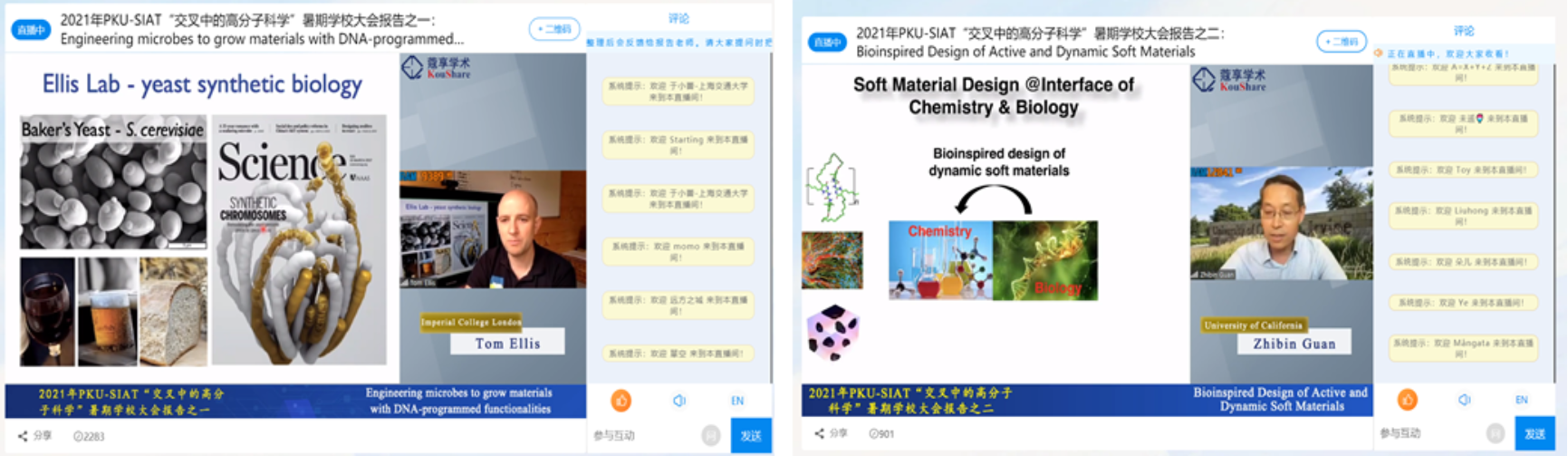 8月4日下午和8月10日上午,暑期学校以两个线上大会报告拉开帷幕,分别由英国帝国理工学院的Tom Ellis教授和美国加利福尼亚大学尔湾分校的Zhibin Guan教授讲授(图1)。Ellis教授讲述了如何利用DNA编程技术使微生物生产“活体功能材料”,Guan教授则讲述了动态软物质材料的仿生设计。每场报告均有超过四千人在蔻享等直播平台上在线观看,并利用留言功能积极参与讨论。Guan教授还分享了交叉学科研究的宝贵经验。