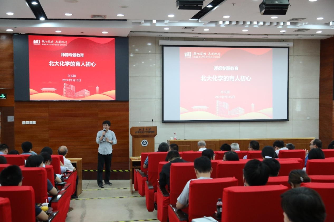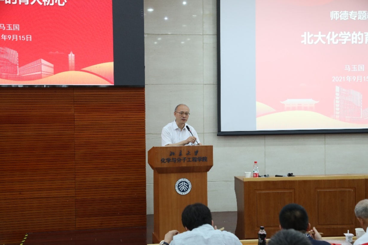 2021年9月15日,北京大学化学与分子工程学院师德专题教育讲座在学院百廿纪念报告厅举办,学院党委书记、师德委员会主任马玉国教授应邀作了主题为“北大化学的育人初心”的报告。共有170余人参加,会议由学院院长陈兴主持。