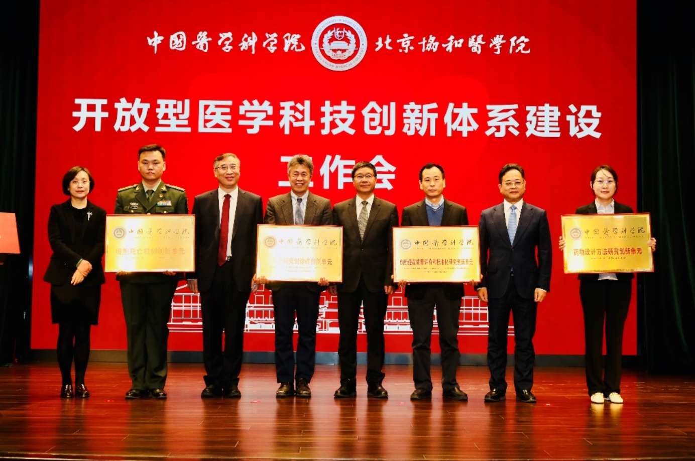 面向国家重大战略需求,创新医防协同机制,中国医学科学院依托院外单位建设一批创新单元,以加快构建多层次协同合作的开放型医学科技创新体系。中国医学科学院于2022年4月13日上午召开了“2022年开放型医学科技创新体系建设工作会”,并在会上为2021年新建的中国医学科学院院外研发机构京内代表授予了牌匾。