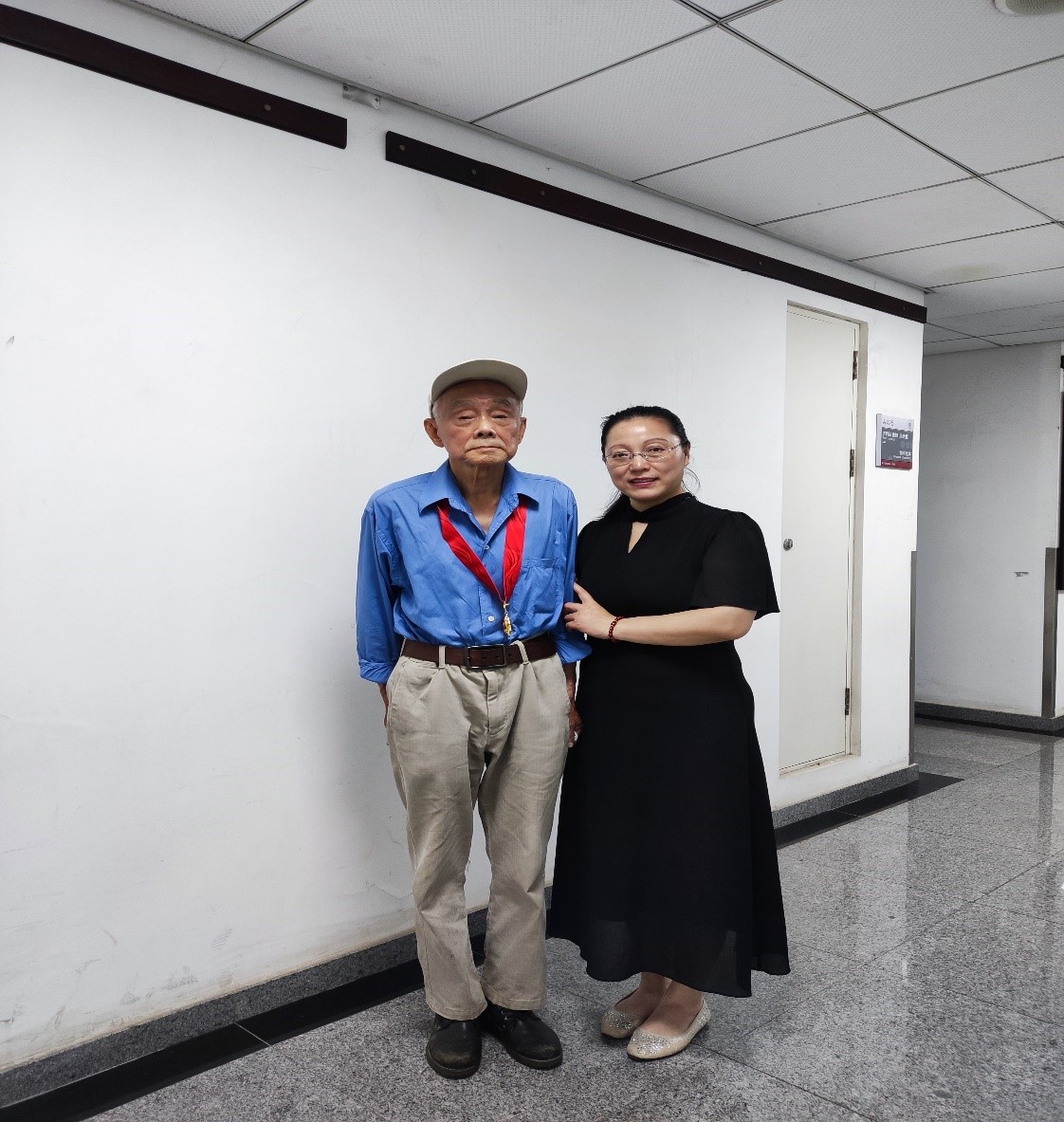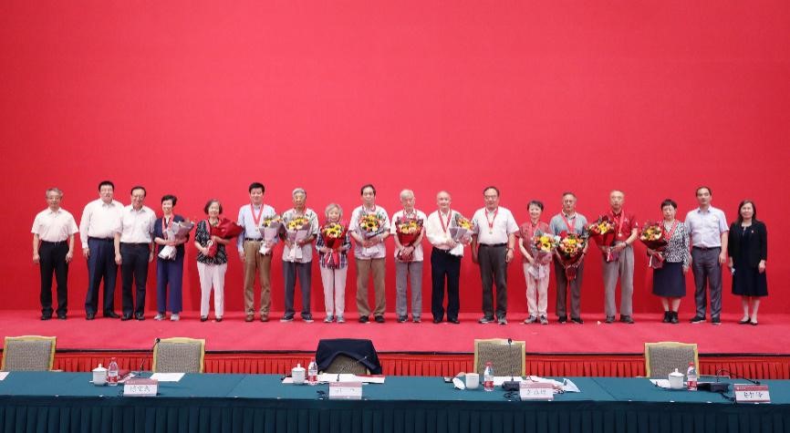 王保怀同志作为老党员代表接受校领导颁发纪念章合影