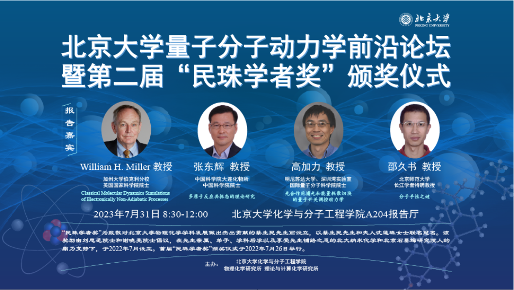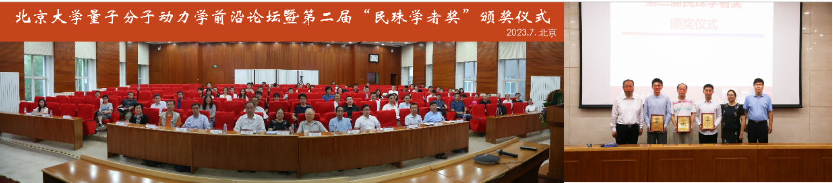 2023年7月31日,由北京大学化学与分子工程学院主办的北京大学量子分子动力学前沿论坛暨第二届“民珠学者奖”颁奖仪式在北京大学化学与分子工程学院A204报告厅成功举行。出席本次活动的特邀嘉宾有:我国著名电化学家、北京大学化学与分子工程学院教授蔡生民先生,蔡先生女儿、“民珠学者奖”重要资助人蔡虹女士,北京石墨烯研究院院长、中国科学院院士、北京大学化学与分子工程学院刘忠范教授,北京大学副校长、深圳研究生院院长、中国科学院院士张锦教授,国家自然科学基金委化学科学二处项目主任沈祥建博士,北京邮电大学理学院夏安东教授,天津大学李新奇教授,北京师范大学苏红梅教授,北京大学化学与分子工程学院刘海超教授、徐东升教授、吴凯教授、盖锋教授、来鲁华教授。共有来自清华大学、北京师范大学、北京理工大学、中国科学院化学研究所、物理研究所、国家纳米科学中心和北京大学物理化学、理论与计算化学专业的师生80余人出席活动,另有40余人通过线上会议系统参加了本次学术活动。
