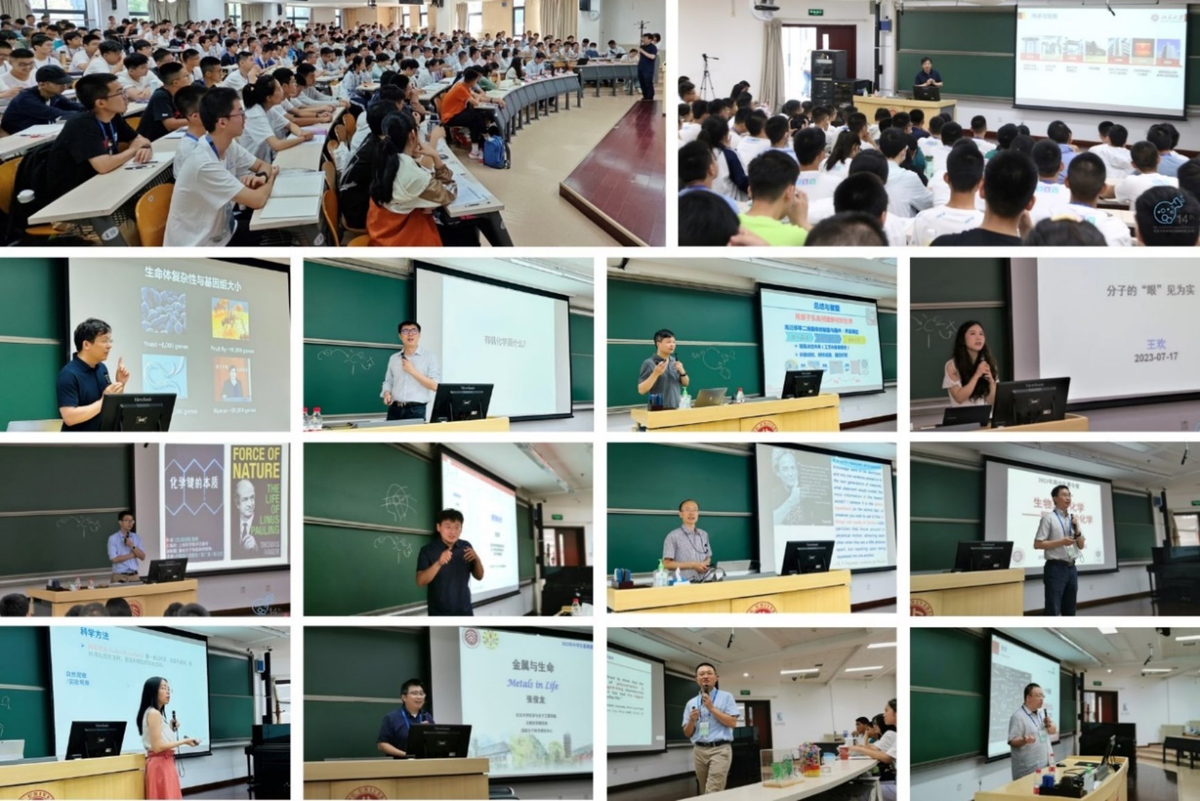 随后的学科前沿讲座环节,来自化学学院各系所中心的老师们分别从各自的研究领域出发,为同学们奉上一场兼具科普和前沿分享的学术盛宴。朱戎老师用猜中分子名称就送实物的惊喜点燃了课堂氛围,以“过渡金属催化”为题向同学们展示了有机化学的吸引力与魅力;彭海琳老师向同学们展示了用“原子乐高”搭建的各种新材料及应用,让大家看到化学根基对于材料大厦的决定性作用;王欢老师以“分子的‘眼’见为实”为主题,带领同学们认识如何调用各种现代设备和分析方法,在单分子的可视化研究领域做出精彩工作;吕华老师以“从物质结构到生命奥秘——鲍林的传奇科研生涯”为题,讲述了化学巨匠鲍林教授传奇的科研生涯及他对化学学科发展所做的巨大贡献;刘志博老师以放疗驱动化的化疗药物靶向释放研究为例,介绍了核药物化学在医学方面的应用及进展;蒋鸿老师从化学中的量子发现传奇谈起,讲述了量子化学的历史与发展,介绍了量子化学与计算化学在诸多前沿领域研究中的应用;邹鹏老师以“生物正交化学——探索生命的化学”为题,结合糖的生物学功能及糖生物学研究面临的挑战,深入浅出地介绍了化学生物学学科的研究及发展;杨娟老师漫谈科学与科学方法、化学与科研,引导同学们全方位提升学习和研究能力;张俊龙老师以“金属与生命”为切入点,介绍了生物无机化学的前沿研究,展现了学科交叉的大趋势和必要性;张文彬老师利用各种教具向同学们形象地展现了生物大分子的奇妙之处,结合文学和哲学,讲解了高分子科学领域的研究方法和进展;马锴果老师通过细数历届诺贝尔化学奖展现了现代化学的风貌,并进一步探讨了现代化学的内涵。听完学科前沿报告,同学们纷纷反馈这场头脑风暴让自己对化学学科的“有趣”和“有用”有了更为深刻的体会,希望自己也能投身此中并乐享其中。