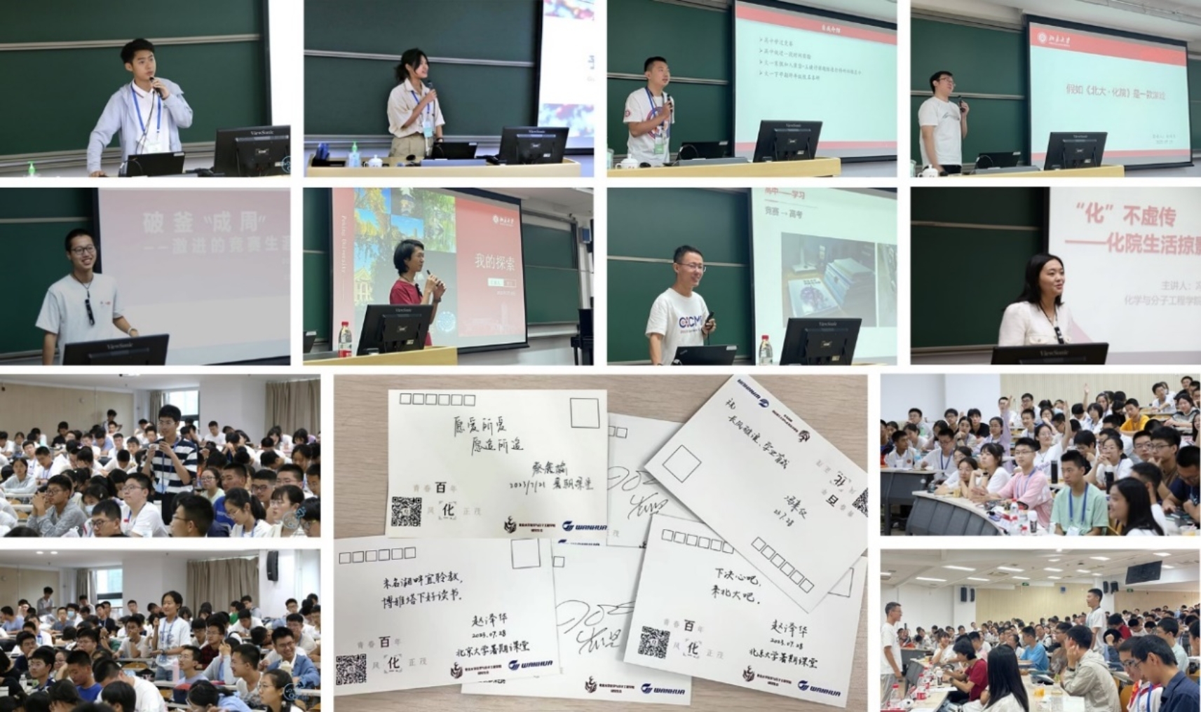 活动的最后一天,是精彩纷呈、轻松愉悦的学长学姐交流环节,来自不同年级的优秀学长学姐们分享了自身的成长经历和学习体会,并对现场学弟学妹们的提问给与了积极的建议。其中2022级的李宗戴学长介绍了他的竞赛和高考经历、以参加实验挑战班和北大招生组招生的经验为例简介了北大教育教学体系和来北大的可行途径;2021级的吴芷涵学姐分享了她走向北大化学的积淀与机遇,以及在北大丰富的学习和课余生活;同是2021级的蔡鑫榆学长分享了他对化学产生兴趣和初入科研殿堂的曲折经历;2017年通过高考进入北大化学院的赵效乐学长目前在化学学院读博,他从打赢游戏的视角回顾了他“前期积累、中期成型、后期推进”的成长之路;2022级的傅周学长、贺文学长从参加国际竞赛获得世界金牌到来北大化学院学习结下了深厚友谊,两位风格迥异的学长联合分享了他们的竞赛经历和在北大一年的学习生活;2020级的赵泽华学长回顾了他从一名竞赛生回归高考奋斗进入北大的经历,以自己三年的学习为例介绍了北大特色的通识教育和专业教育;今年本科毕业的冯来仪学姐已被保送为化学生物学系研究生,她重点分析了高中化学和大学化学的异同,要从“是什么”转到“为什么”的学习,分享了如何融入大学学习和提高学习效率的经验和体会。现场讨论气氛热烈而愉快,徐金荣老师主持交流,并为提问的同学赠送了学长寄语明信片。