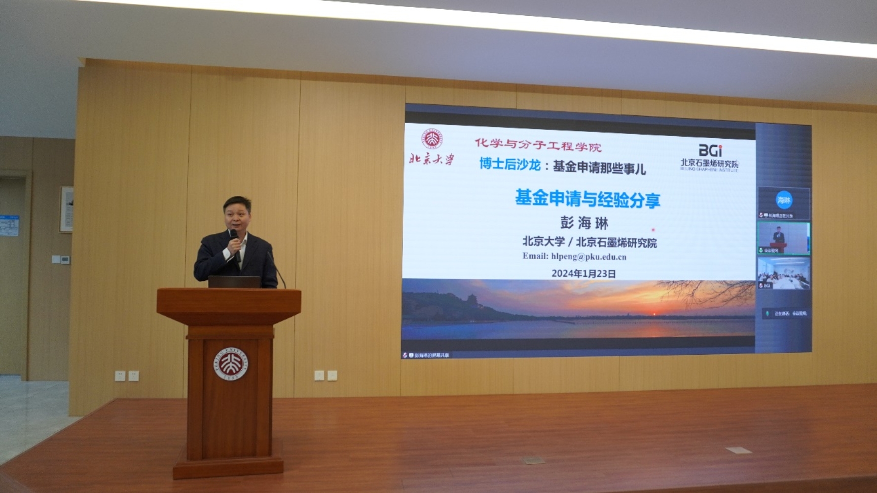 2024年1月23日上午,由北京大学化学与分子工程学院和北京石墨烯研究院共同组织的自然科学基金申请布置会(博士后专场)在化学学院肖伦报告厅(101大教室)和北京石墨烯研究院博雅厅同步连线进行,布置会由化学学院科研办公室、石墨烯研究院科技发展部共同筹办,邀请到化学学院副院长、北京石墨烯研究院副院长彭海琳教授作专题报告,百余名青年科研人员参加了本次活动。