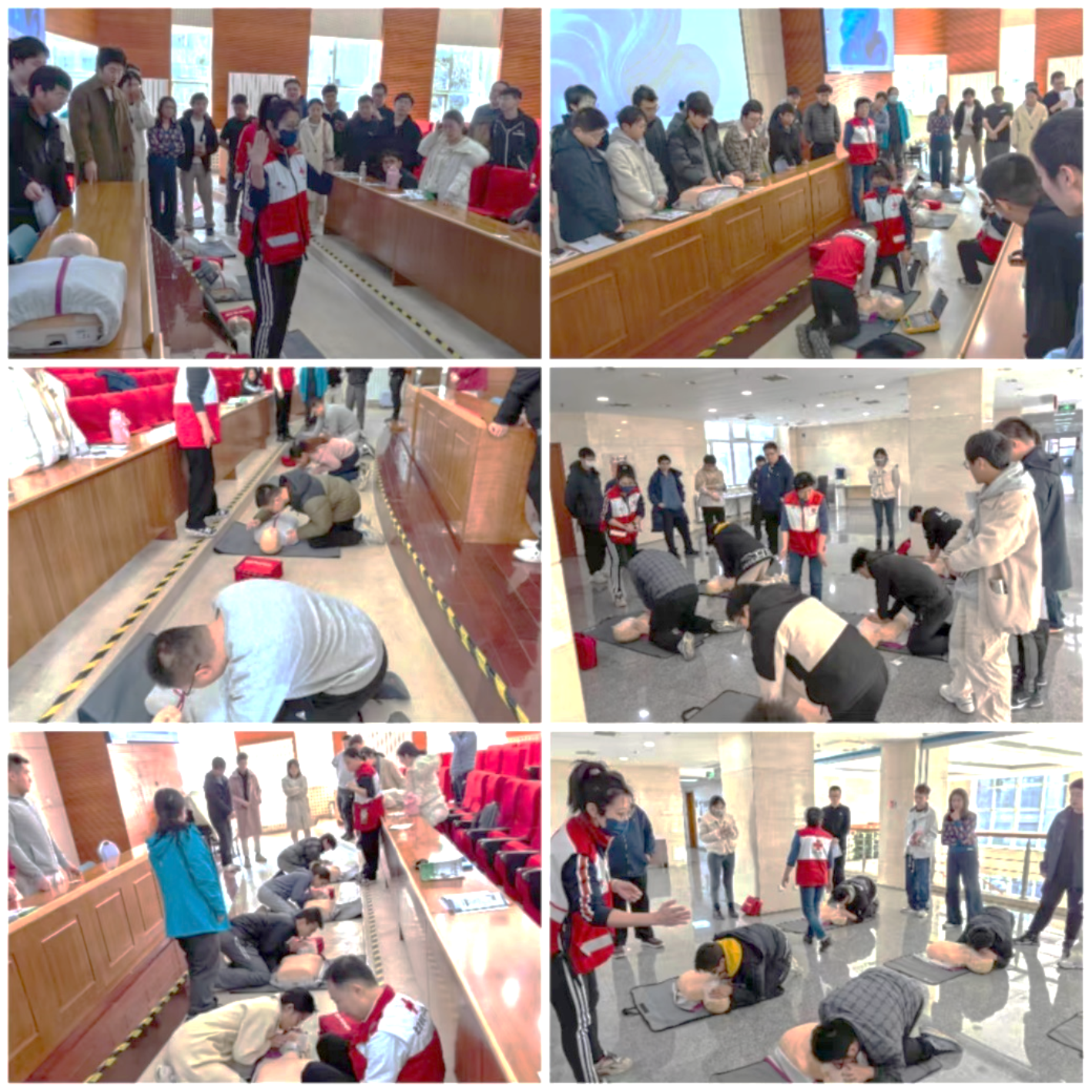 在合影留念后,四位讲师将参与课程的师生分为两大组,利用模拟假人,分别进行了“单人心肺复苏”和“双人心肺复苏+AED”的整个急救流程实操练习。讲师们悉心指导每位师生的操作,对不规范的动作进行了耐心的示范和纠正,经过近两个小时的练习,参与培训的师生全部顺利通过了考核。通过专业的理论培训和生动的模拟演练,大家更深刻地掌握了心肺复苏及AED急救技能,有助于在遇到突发情况时,能及时采取有效的急救措施、挽救生命。