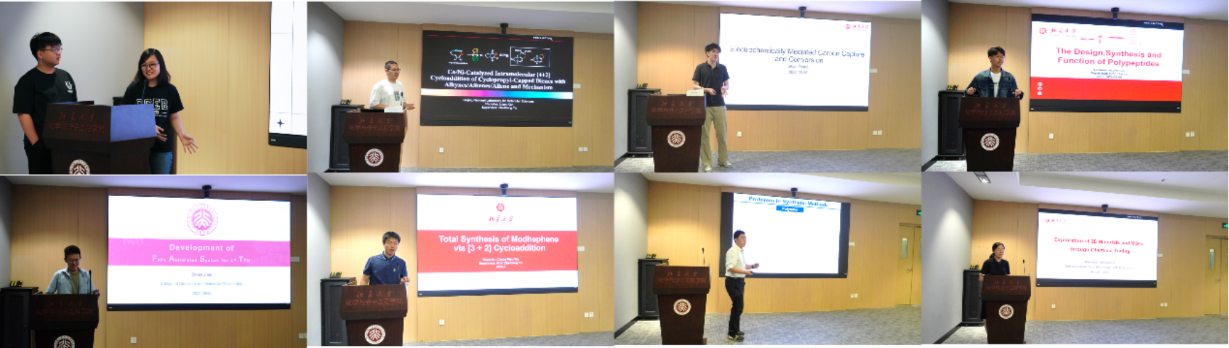 午间时段,一场由学生主导的别开生面的交流午餐会在轻松愉快的气氛中进行。上下半场报告分别由北大化学学院的赵泽华和蔡浩然两位同学主持,阚立言、张基汉、蔡浩然、赵泽华、武承文、苏亚、孙艺航等七位同学和南洋理工大学的Chua Zhi Qi同学分别分享了自己的科研工作,内容从催化剂的创新应用到绿色化学的前沿探索,学生们互相提问,自由交流,其乐融融。