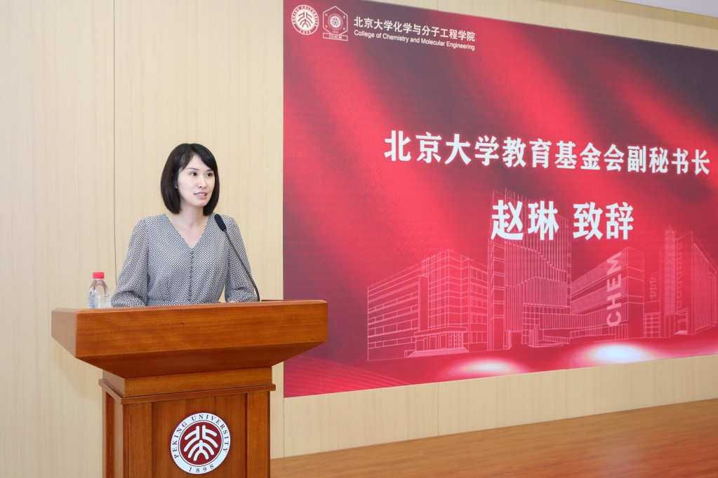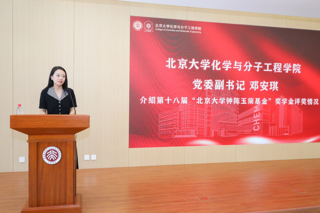 邓安琪介绍了第十八届“北京大学钟陈玉蘭基金”的评奖情况。今年,化学学院共评选出19位品学兼优的在读研究生获得钟陈玉蘭奖学金,其中一等奖2人、二等奖6人、三等奖11人。同时,化学学院按照教学科研、管理岗位分别提名,评选出4位教师获奖。邓安琪表示,在钟氏夫妇精神的激励下,更多的学子和教师将继续努力,为化学事业的发展贡献力量。