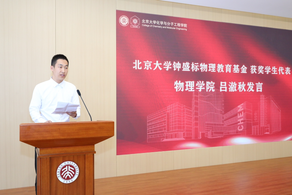 物理学院获奖同学代表吕澈秋代表所有获奖学生感谢钟氏夫妇的慷慨捐赠和支持。他表示,他将继续秉承钟盛标先生的精神,不断探索未知,勇于创新,为科研报国贡献力量。