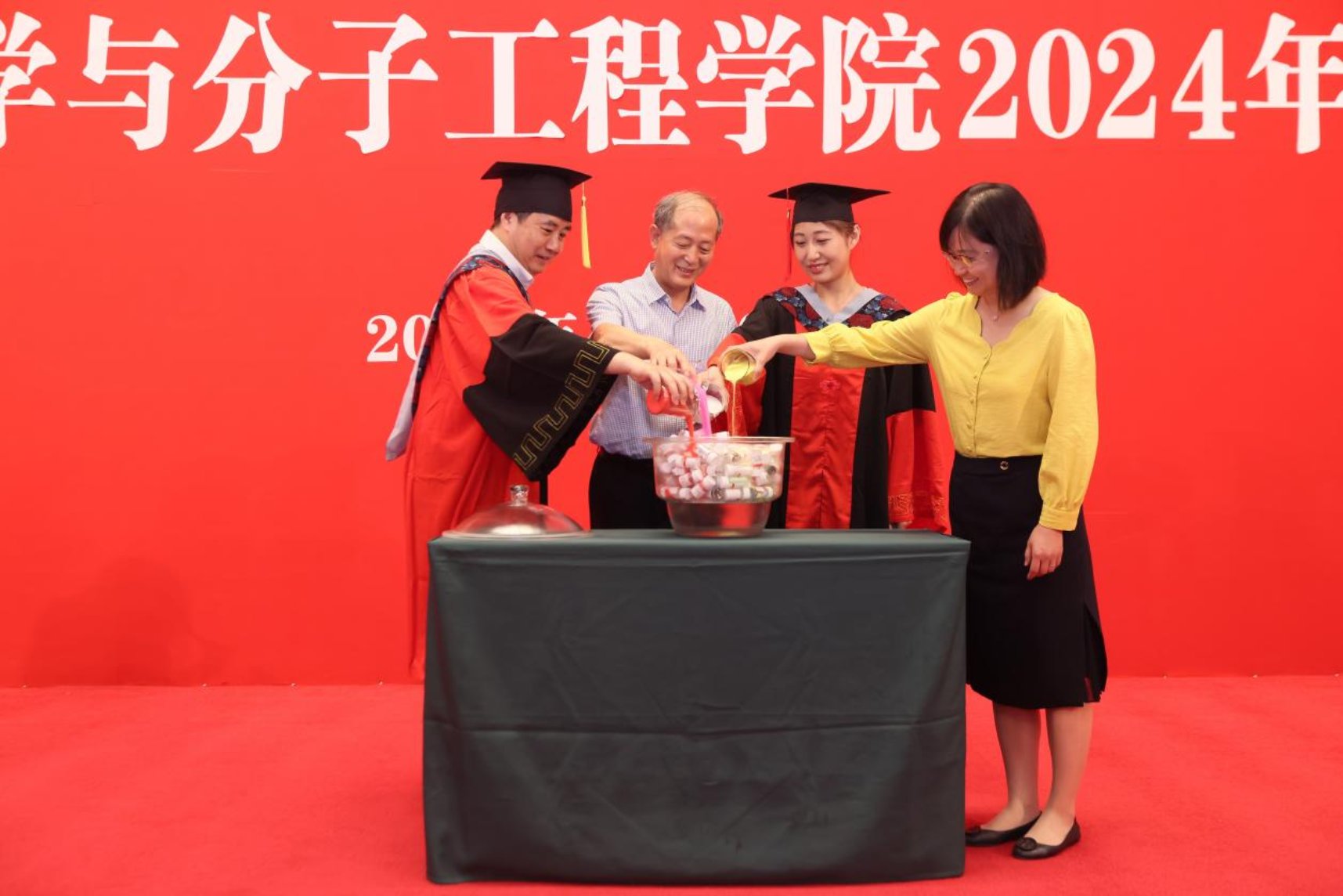 党委书记裴坚教授的毕业致辞将现场氛围推向高潮。裴坚向圆满完成学业的毕业生表示祝贺,并给即将迈向人生新阶段的学子们提出了三点期望:一是要勇于担当,能独当一面,真正做到为自己的人生负责,探索自己,探索世界。二是要从容面对挫折,能宠辱不惊,在专业学习中不仅要练就熟练的操作技巧和严谨的科学思维,更要练就面对失败与成功的态度,做到不气馁也不骄躁。三是要善良对待每一个人,能平等待人。“北大人”意味的不应当是光环,而应该是“兼济天下”的担当和作为。今年学院特别为每位毕业生赠送了刻有姓名的定制保温杯,寓意“一辈子”的陪伴,学院永远是毕业生同学温暖的家。