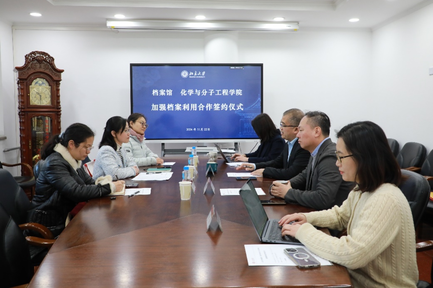 11月22日上午,档案馆与化学与分子工程学院在档案馆二楼会议室隆重举行签约仪式,旨在深化双方在档案利用和数字化管理等方面的合作。档案馆校史馆馆长余浚、副馆长贾永刚、技术编研办主任郭鹏、管理利用办公室副主任陈香、化学与分子工程学院党委副书记高珍、科研办公室副主任牛林、综合办公室副主任吴菁参加签约仪式。