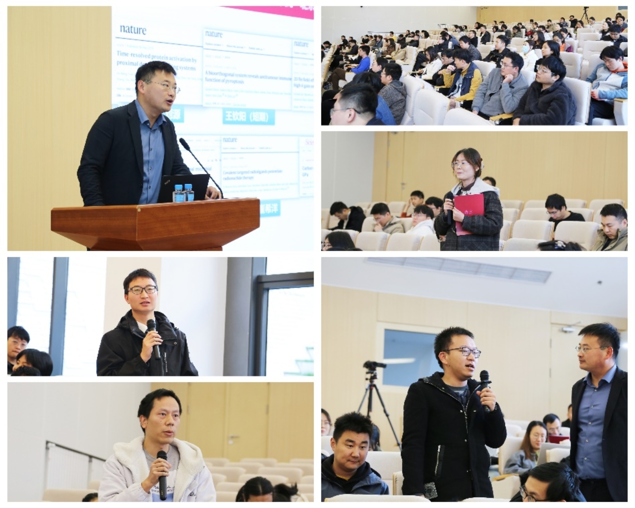 在答辩过程中,博士后们展示了他们在化学领域的最新研究成果。宛新华课题组博士后陈艺夫博士作为题为“手性控制的晶体定向运动”的报告,研究了手性控制晶体在光热力等外界刺激下的定向运动,为晶体拆分提供了新方法。张锦老师课题组博士后冯雪廷博士报告题目为“纳米碳材料的可控制备及其在能源方面的应用”,聚焦于石墨双炔的快速合成方法及其在电化学合成氨中的应用。雷晓光老师课题组博士后郭富生博士报告题目为“药物转化价值导向的化学遗传学”,探讨了化学遗传学在药物研发中的作用,特别是在抗生素和免疫治疗领域的应用。接下来,陈鹏老师课题组博士后林锋博士做了题为“多细胞招募的生物正交抗体平台靶向实体瘤免疫微环境”的报告,介绍了生物正交化学在免疫疗法中的应用,特别是在多特异性抗体介导的免疫疗法中的研究进展。最后,刘志博老师课题组博士后穆博帅博士做了题为“辐射驱动的氧化还原方法学研究”的报告,介绍了他如何在实验室实现的氮气、氧气和二氧化碳等空气主份的辐射催化转化,并探讨了这种转化策略的潜在应用。