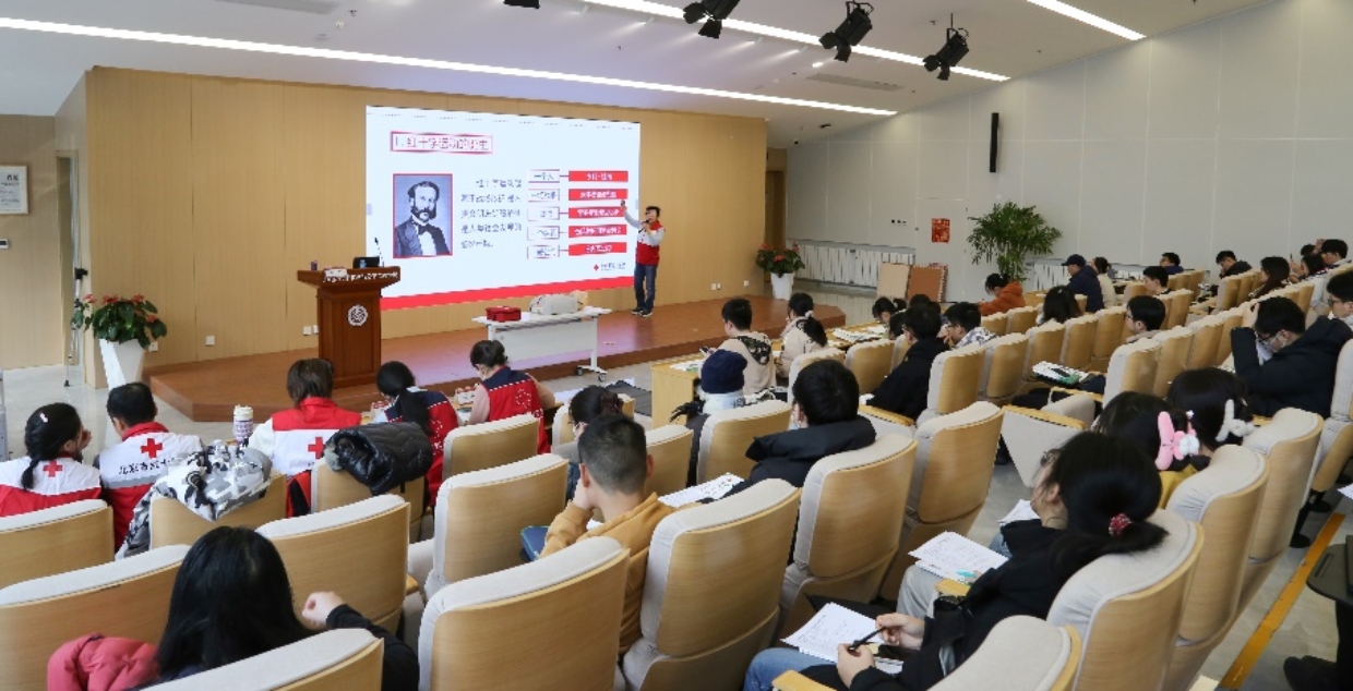 在肖伦报告厅内,来自北京市红十字会专业急救团队的督导员鲁学红、张源源,理论主讲刘颖,操作辅导员李震宇、田园、吴琳等六位资深老师,通过“理论筑基+实操强化”模式,为师生们系统构建了急救知识框架。刘颖老师以红十字运动百年发展为引,结合全球急救数据,深入剖析“黄金四分钟”的生死时速:“心脏骤停后前4分钟的有效急救,能将存活率提升至50%以上”。通过地铁站、运动场等场景化案例对比,配合动态解剖示意图,生动演示了“环境评估-意识判断-胸外按压-人工呼吸”的标准化流程。