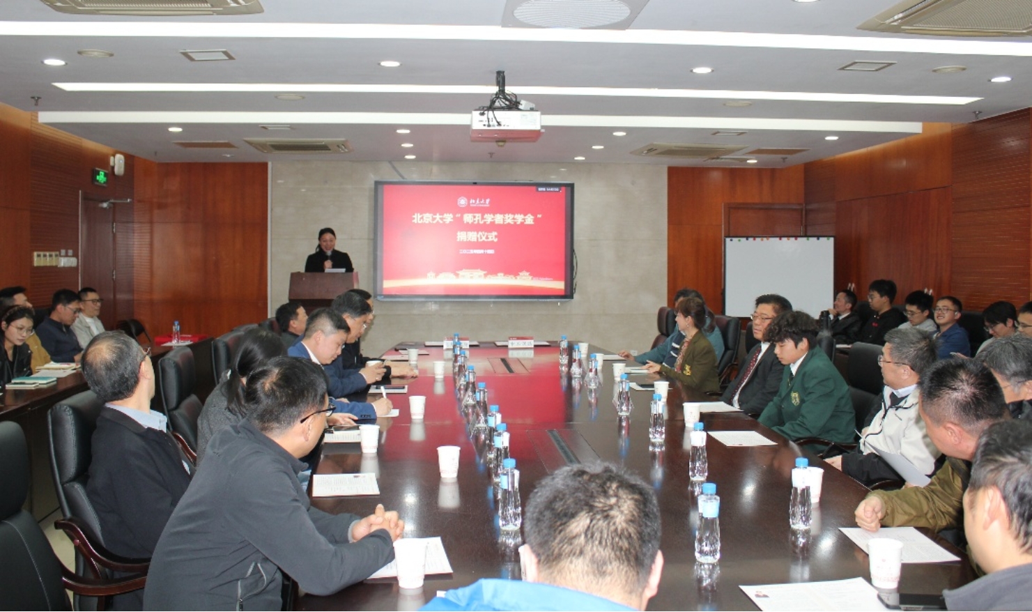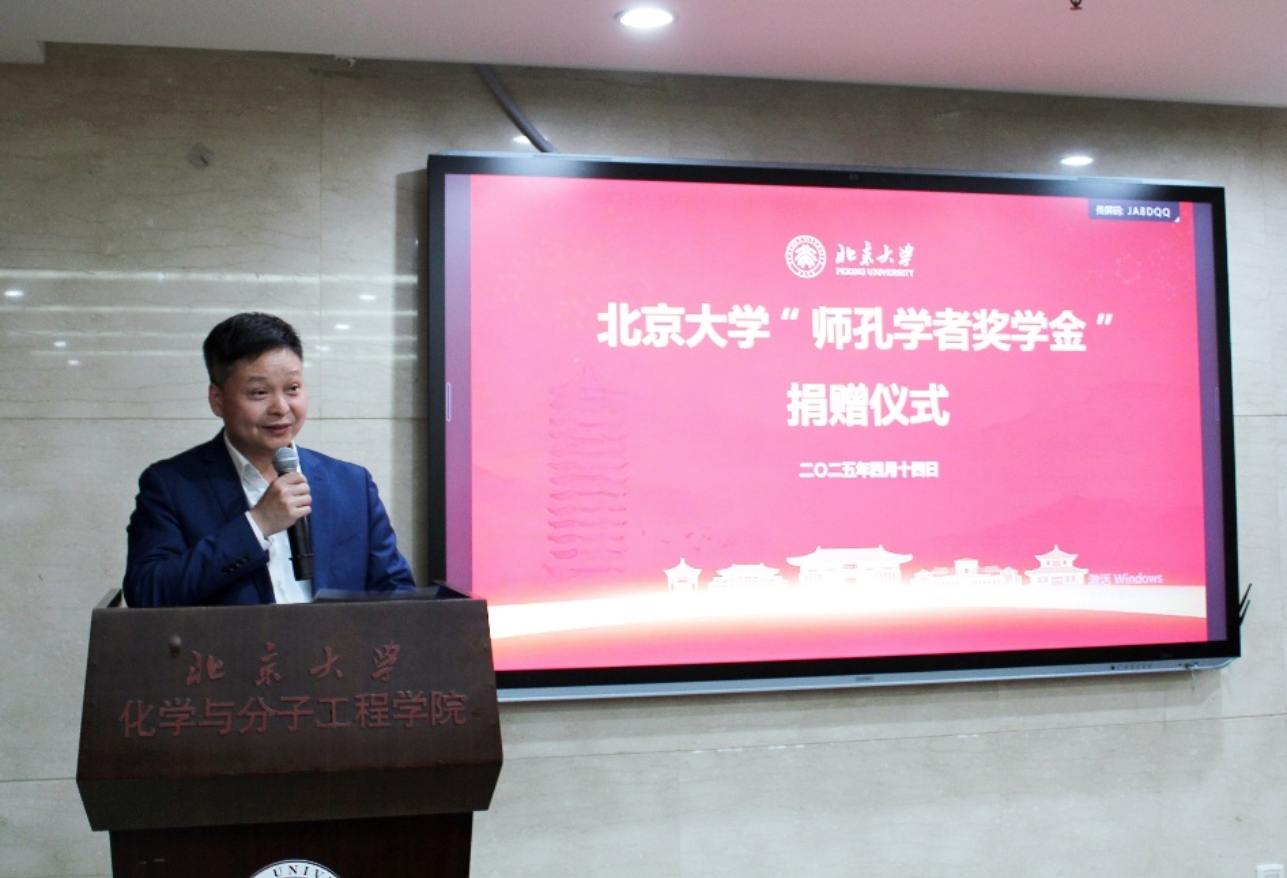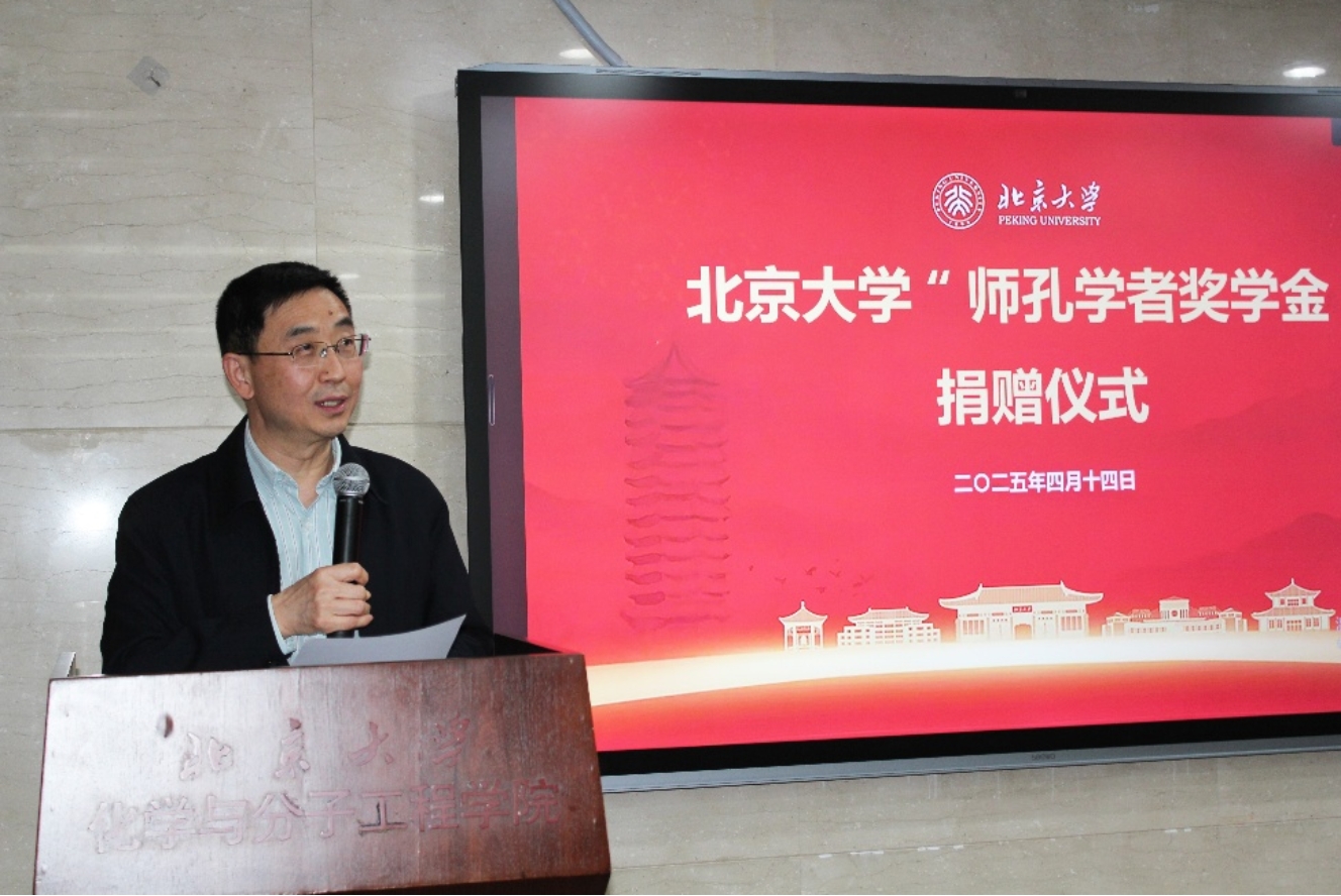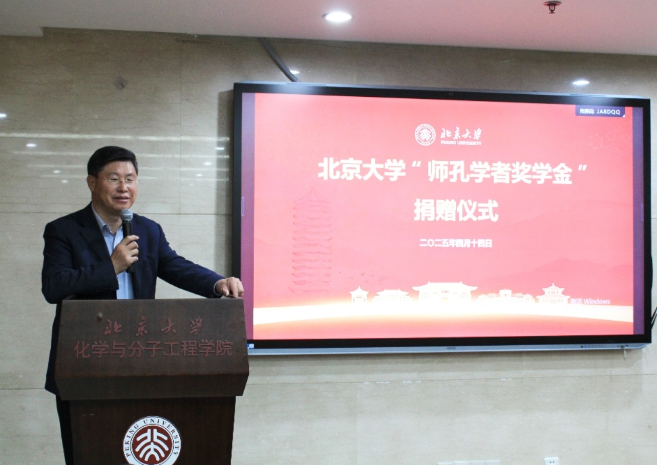 2025年4月14日下午5时30分,北京大学“师孔学者奖学金”捐赠仪式在化学与分子工程学院A717隆重举行。北京中石润达科技发展有限公司总经理刘伟、沈润梅伉俪携子刘众泽出席,以家族名义捐资设立奖学金,用于资助化学学院品学兼优的研究生。该奖学金以沈润梅女士的父亲、我国著名物理化学家沈师孔先生命名,专门用于支持北京大学物理化学专业的研究生培养。中国科学院院士刘忠范教授、化学学院院长彭海琳教授、学院发展办公室王芊越老师,及化学学院物理化学专业的师生出席活动并一同见证这一重要时刻。仪式由化学学院物理化学研究所副所长阎云老师主持。