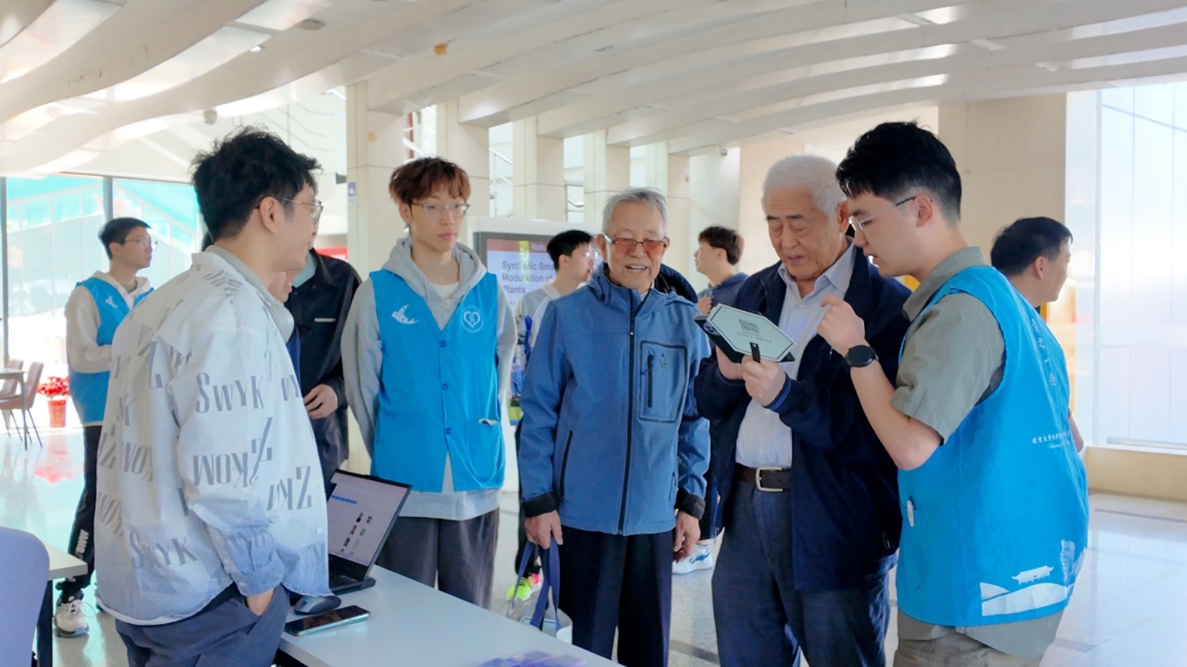 为更好地服务校友返校,5月3日至4日,学院校友会在北门设立校友接待站,学生志愿者协助校友办理电子校友卡申领、随行人员入校预约等事宜,并向校友赠送定制纪念透卡、院系特色扇子等礼品。校友们在志愿者引导下参观学院新貌,回忆往昔。