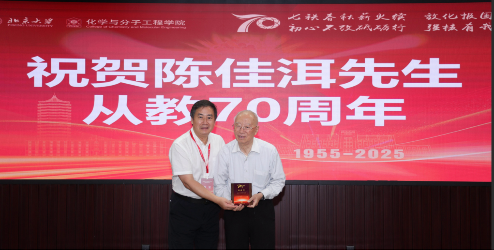 化学与分子工程学院党委书记裴坚教授代表应用化学系为陈佳洱先生颁发纪念牌