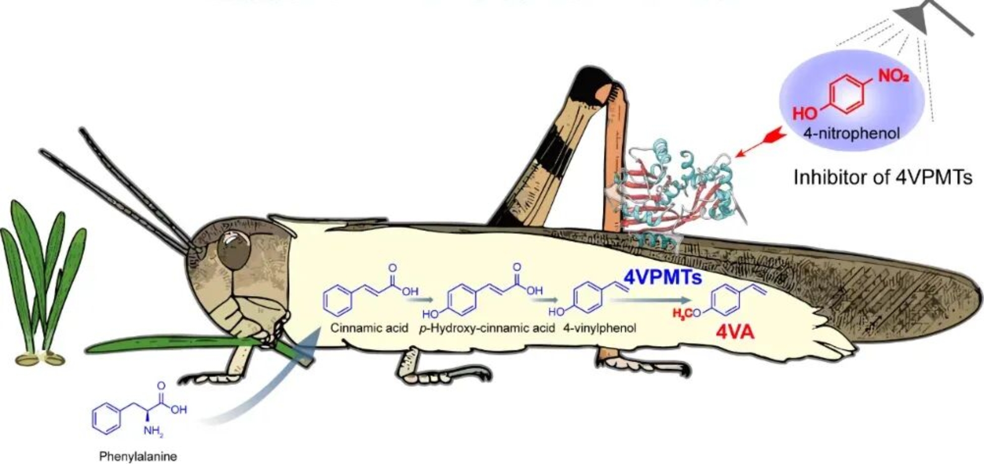 图1. 蝗虫群聚信息素4VA的生物合成解码与行为操控