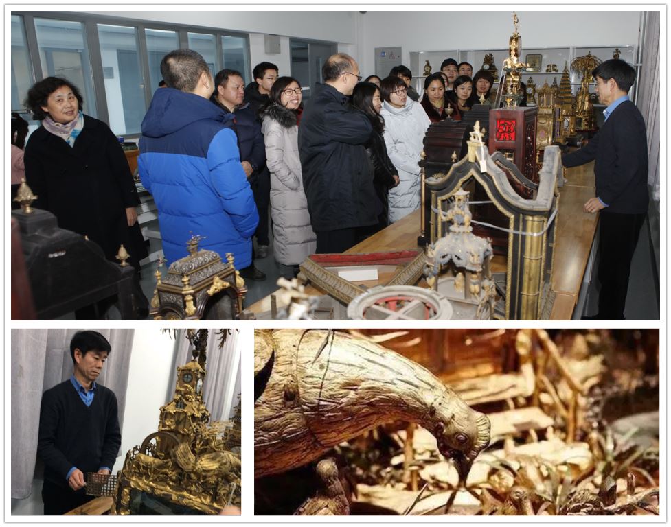 随后,雷勇副主任带老师们参观了部分文物修护工作室。大家现场观摩了古代钟表、织绣、字画、青铜器等文物的修复过程,并与文物“医生”们进行了交流。文物钟表修复技艺国家级非文化遗产传承人王津老师也在文物钟表修护工作室和大家进行了交流互动。大家亲眼目睹了纪录片《我在故宫修文物》拍摄时尚在修复的“铜镀金乡村音乐水法钟”在修好后的机械运动过程,纷纷感叹是修复大师的精湛技艺让文物钟表展现出如此神奇的魅力。