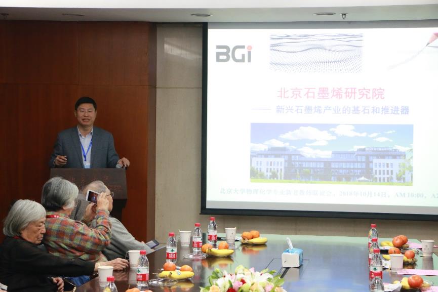 之后,刘忠范院士向在座的各位介绍了近期成立的北京石墨烯研究院的概况。通过刘老师的介绍,大家不仅对石墨烯研究院有了更加深入的认识,也认识到了物化所在相关领域已经达到的前沿水平,更了解到学院以及物化所在校地合作、产学研结合等方面所做的积极努力和丰硕成果。