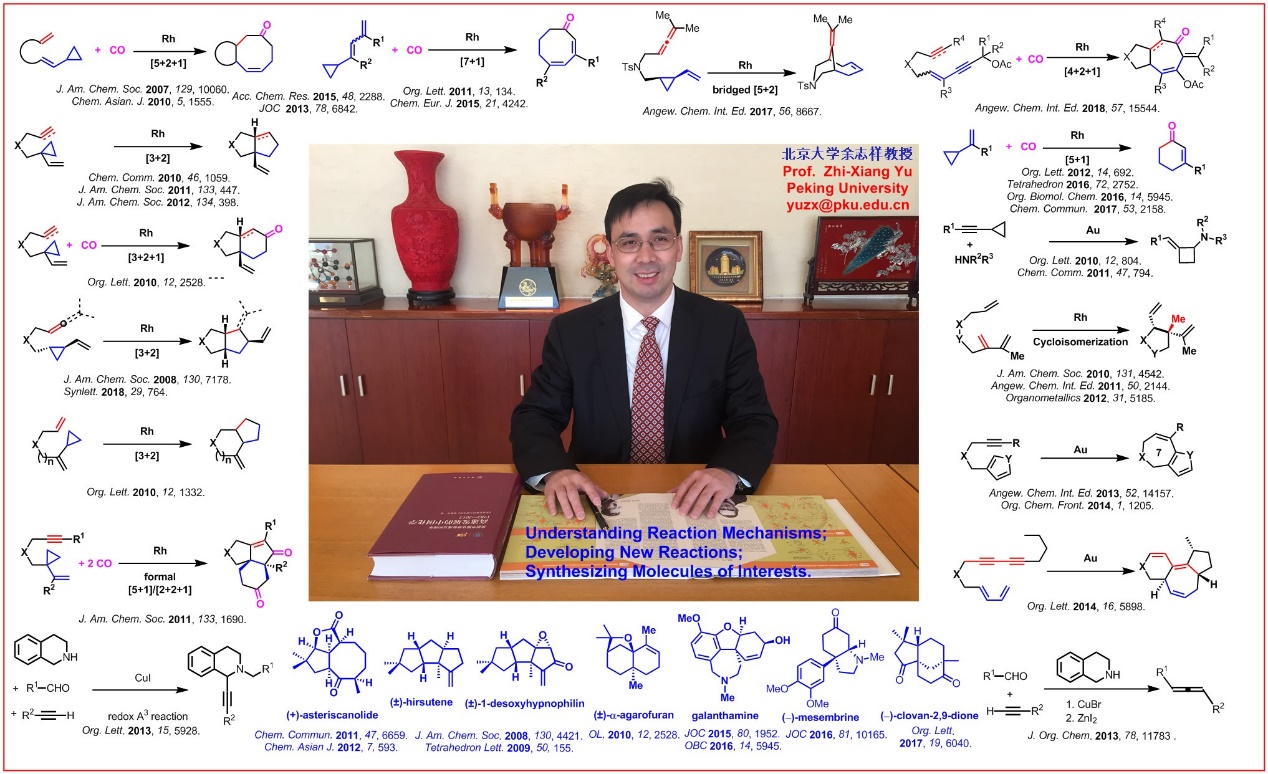 余志祥课题组主要将理论计算和有机合成相结合来研究有机化学反应机理,发展新的有机化学反应,以及将所发展的反应应用于天然产物合成和新药研发。在发展新反应方向,该课题组已发展了多个不同环系的成环反应,包括[3+2], [5+1], [3+2+1], [5+2], [4+2+1], [7+1], [5+2+1]等。在天然产物和药物合成方向, 他们已将[5+2+1], [3+2+1], [5+1]反应应用到Asteriscanolide, Clovandione, Galanthamine, Hirsutene等多个天然产物的合成(见下面图片介绍)。“化学空间”也对余志祥教授进行过专访报道,详细内容参考以下网址:https://cn.chem-station.com/interview/cchemist/2018/11/