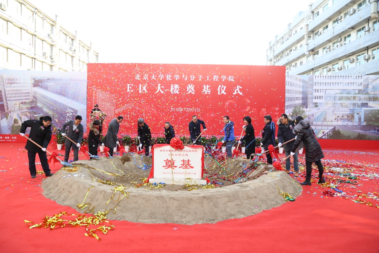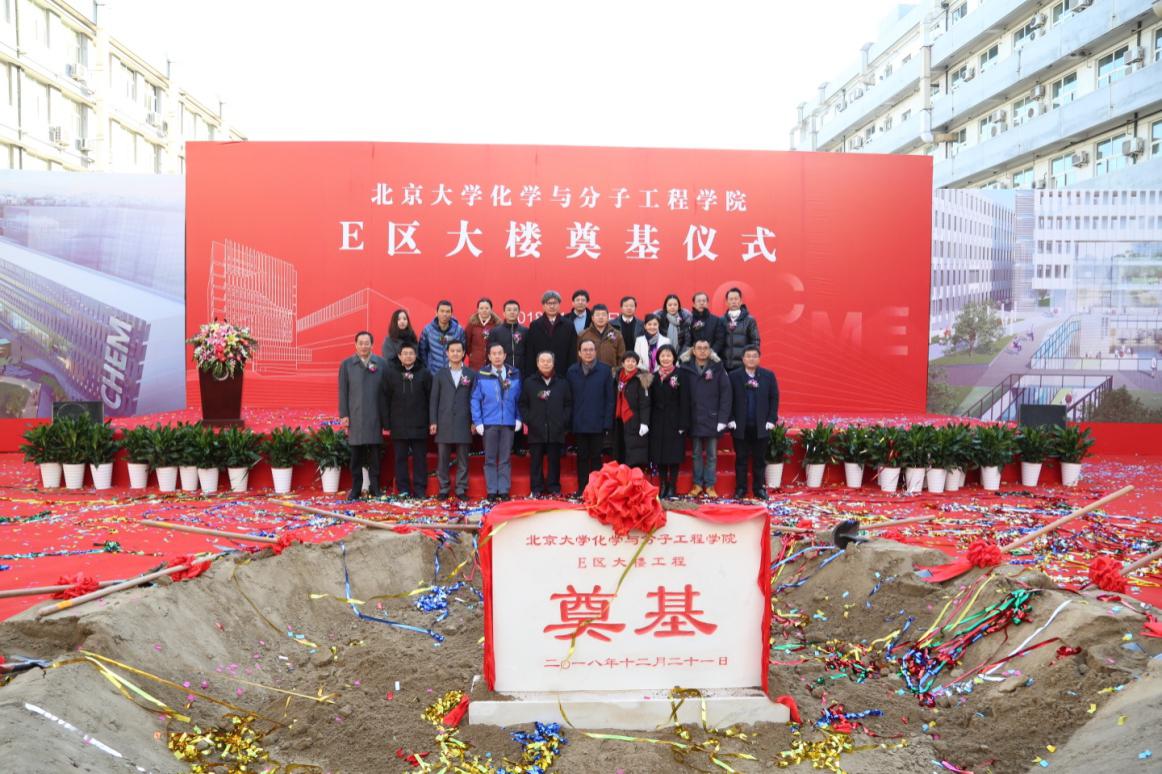 2018年12月21日,化学学院“E区大楼”奠基仪式在学院新楼建设工地举行。北京大学原校长周其凤院士、林建华教授,北京大学副校长王博教授,“E区大楼”捐赠人,1981级校友、松禾创业投资公司董事长厉伟先生,深圳市蓝凌软件股份有限公司总裁徐霞女士,深圳市金凤凰装饰工程有限公司董事长刘宏洲先生,深圳市宏禧聚信传媒股份有限公司董事长张朔先生,筑博设计集团股份有限公司设计师张晓奕女士,北京大学校友会执行副会长邓娅老师及学校财务部、房地产管理部、基建工程部、燕园街道办事处、会议中心等职能部门的负责人同化学学院师生一起参加了奠基仪式。北京大学校长郝平教授参加了奠基仪式前与新楼捐赠人的座谈活动。