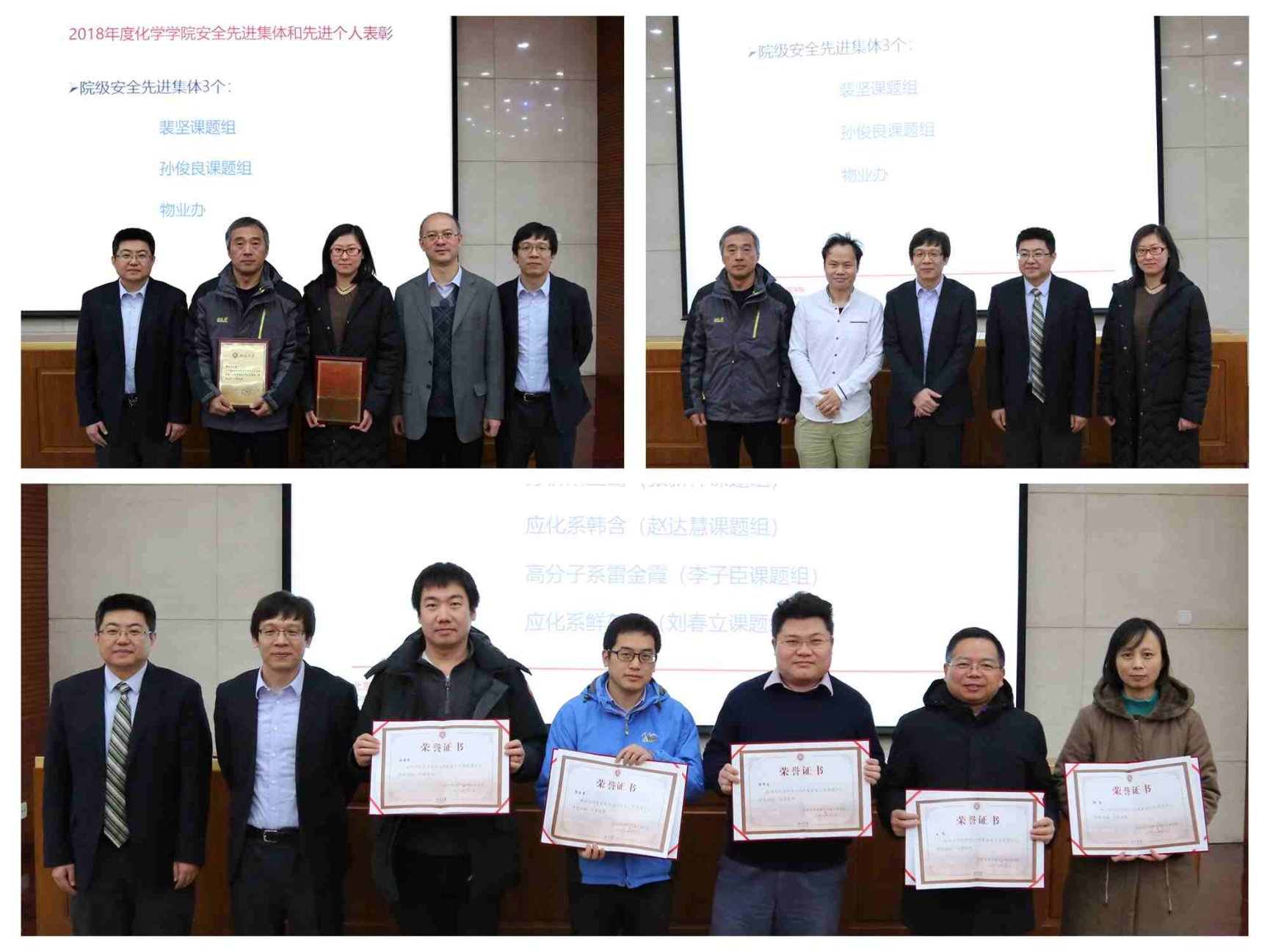 周江报告了财务、安全等方面的工作,汇报了2018年学院的财务收支状况,强调了财务报销相关规定,介绍了个税扣除的相关政策,并报告了学院安全工作情况。最后,宣布了本年度化学学院安全先进获奖名单,并进行颁奖。2018年度,化学学院也被评选为“北京大学安全管理标准化建设先进单位”。
