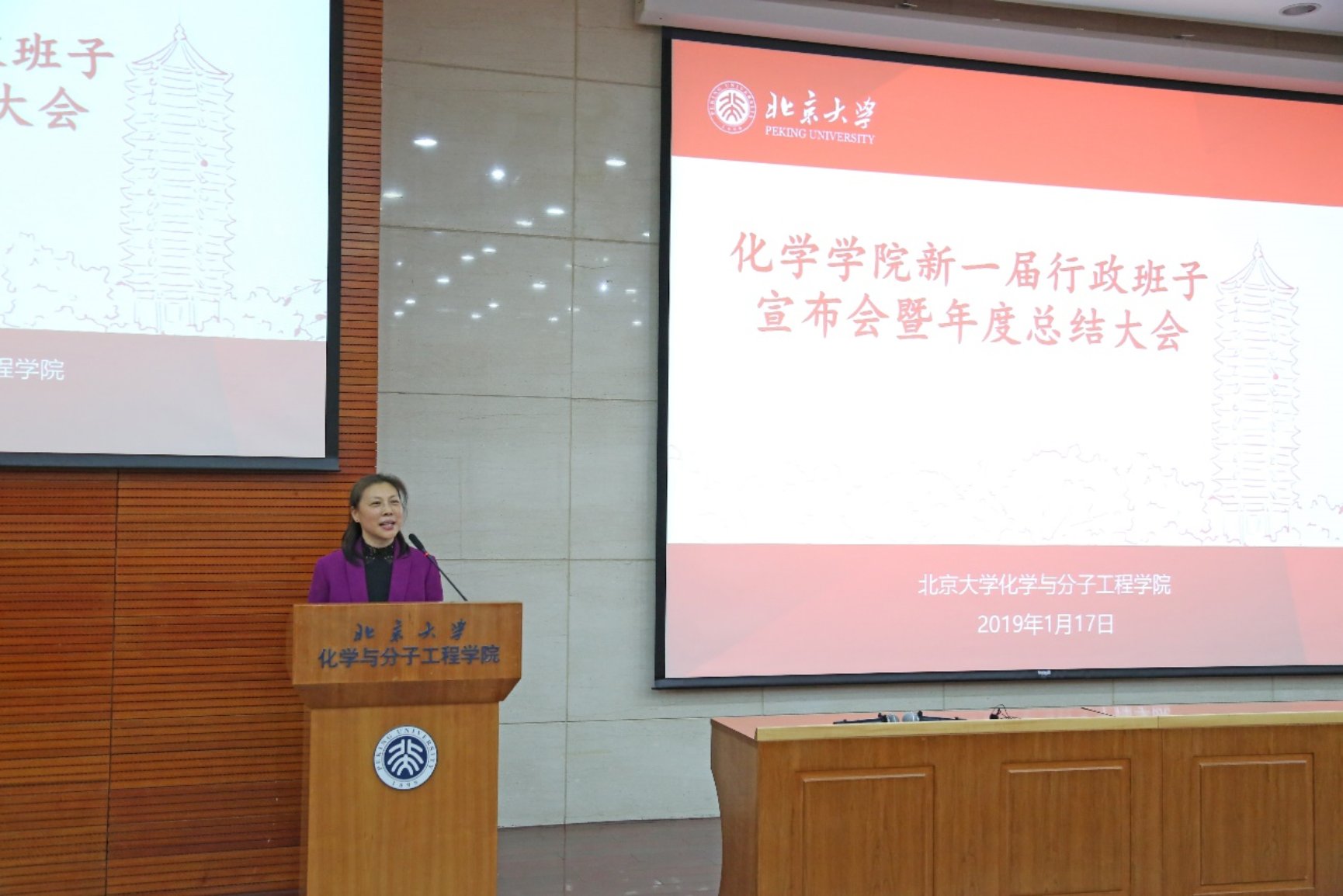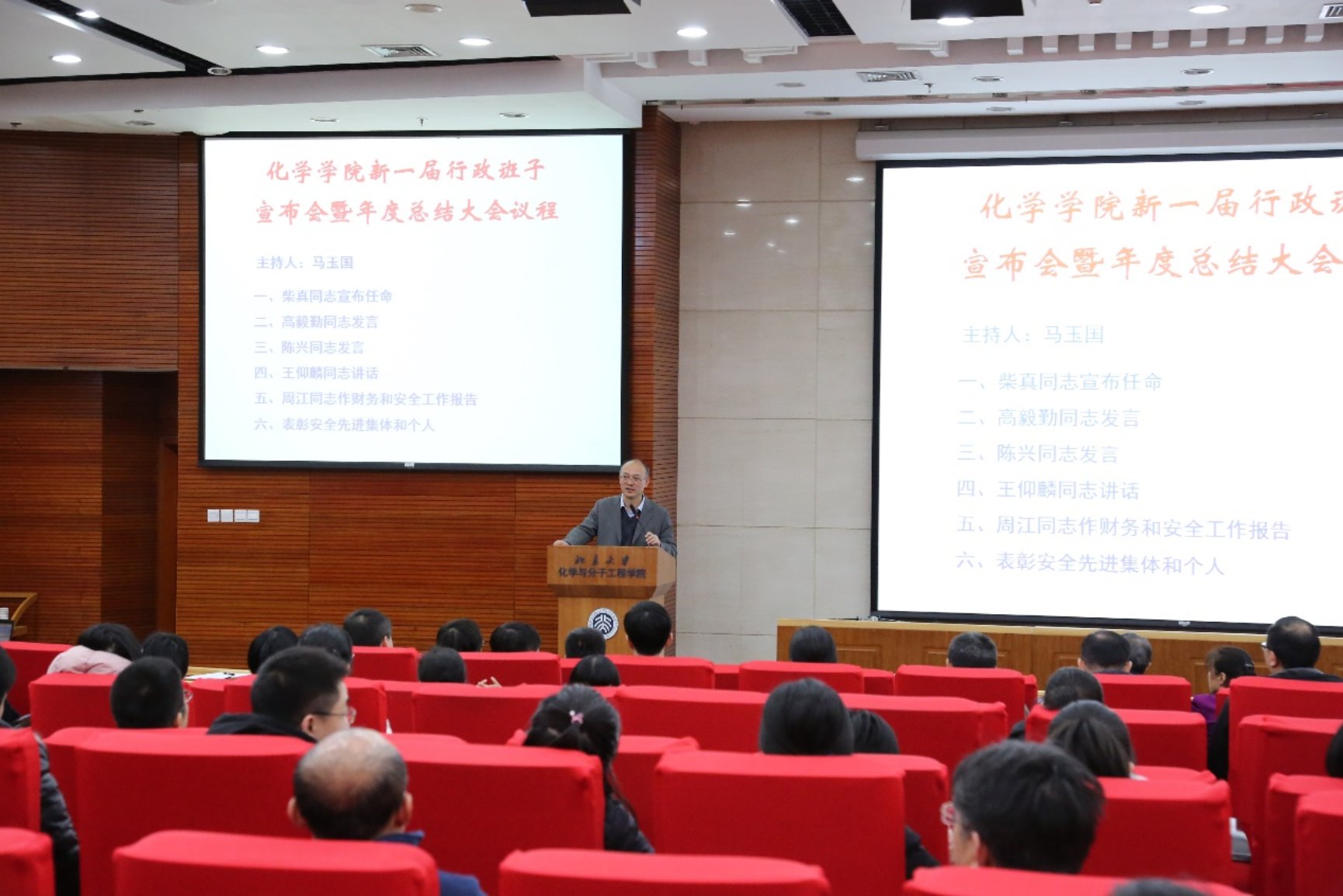 柴真宣布了北京大学关于化学与分子工程学院行政班子任职的决定,任命陈兴为北京大学化学与分子工程学院院长,吕明泉、甘良兵、王颖霞、陈继涛、彭海琳为北京大学化学与分子工程学院副院长。原班子成员自然免职。并通报了新班子产生的过程。她对化学学院上一届行政班子的工作给予充分肯定,认为上一届班子公正务实、开拓创新,为学院的改革发展作出了重要贡献。