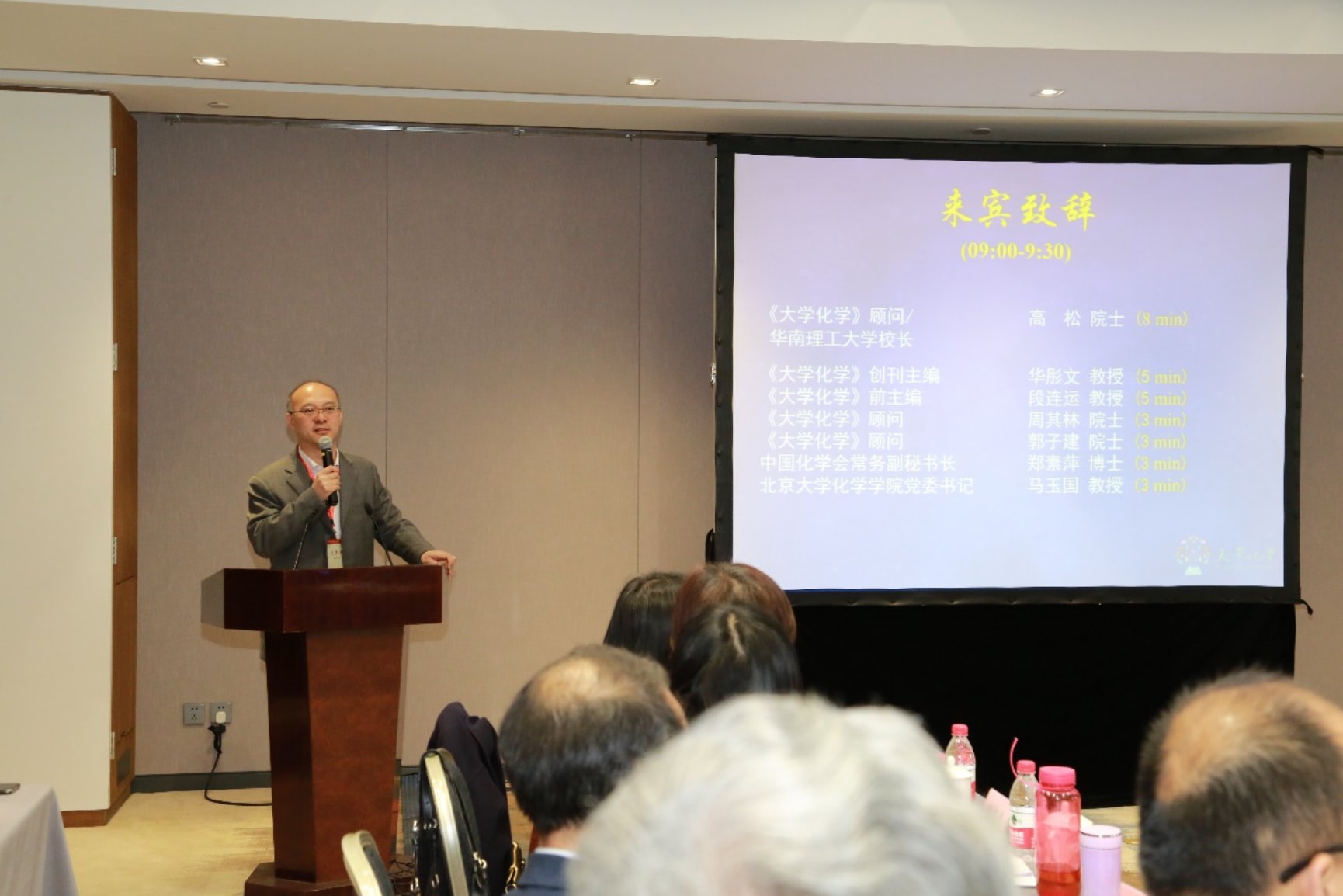 会议开幕式由时任《大学化学》主编裴坚教授主持。首先由《大学化学》顾问、华南理工大学校长高松院士致辞。他指出教育的根本目的是育人,未来的大学化学教育更应该思考如何激发学生的学习热情,使其热爱并愿意投身化学行业,为我国的化学学术研究、化工事业发展源源不断地输送人才;化学教育的目的还包括普及化学知识,使社会公众能够理解化学世界,理解化学从业者工作的意义。接下来由前主编华彤文教授、段连运教授,顾问周其林院士、郭子建院士,郑素萍博士和马玉国教授分别致辞。随后裴坚教授宣读了《大学化学》第五届编委会获奖委员名单并请嘉宾上台为获奖委员颁奖。之后举行了《大学化学》第六届编委会聘任仪式,由马玉国教授为新任主编王颖霞教授颁发聘书,郑素萍博士、彭海琳教授、王颖霞教授先后为顾问、副主编和编委们颁发了聘书。