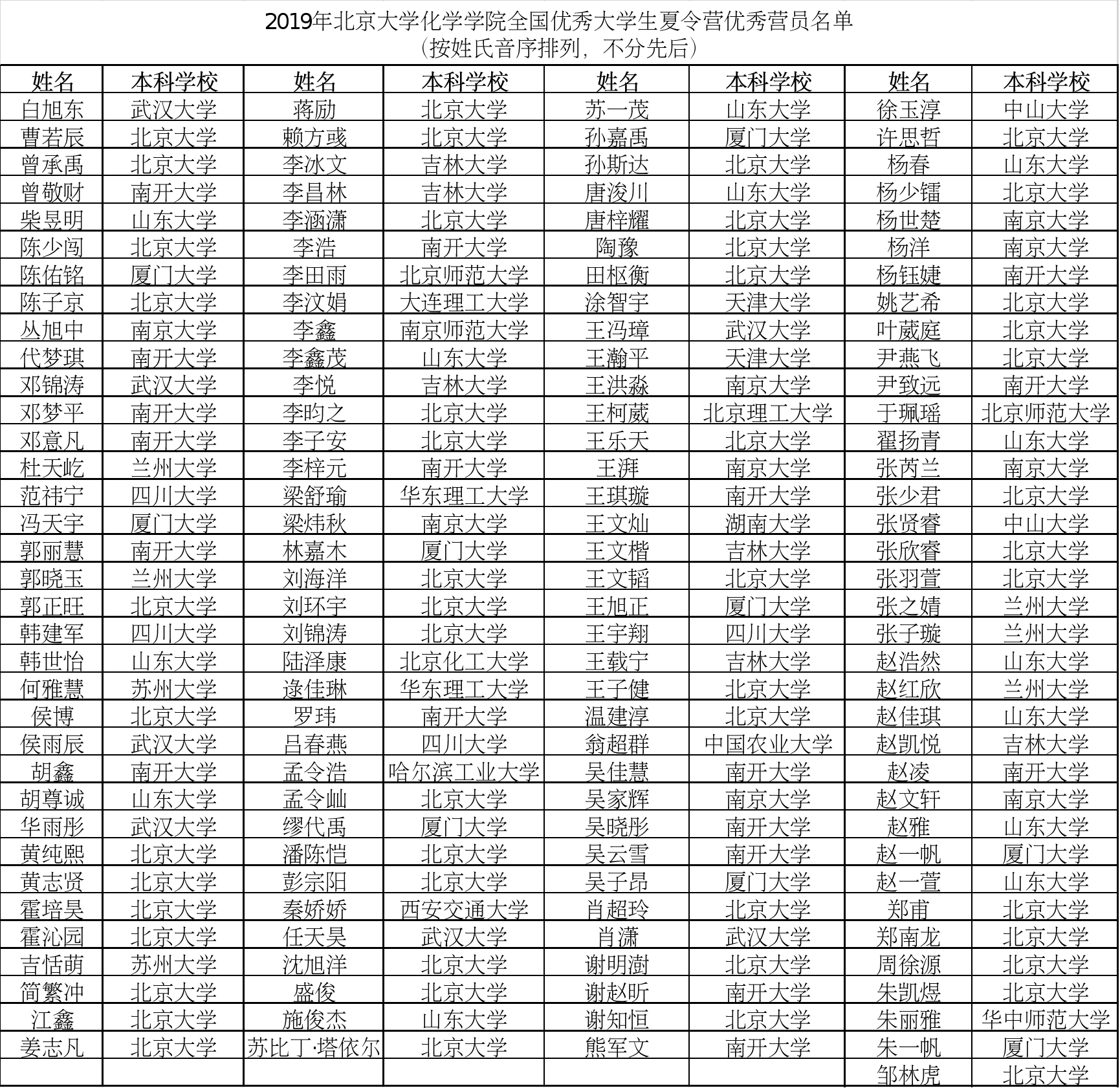 在为期4天的北京大学2019年度全国优秀大学生化学夏令营活动结束之后,共评选出优秀营员141名,先进营员25名,名单如下所示(优秀营员按姓氏排序,先进营员按优先顺序排序)。