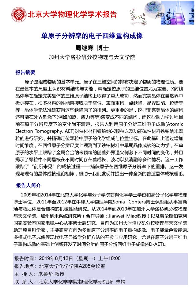 【北京大学物理化学学术报告】单原子分辨率的电子四维重构成像
