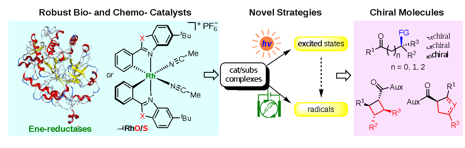 在这次报告里,我将分享我从合成化学到合成生物学的研究故事,展示我们在光/电引发的不对称催化领域,如何克服上述难题,实现多种手性骨架的高效、高立体化学选择性合成。具体包括:一、利用独特的金属中心手性的八面体铑催化剂,发展的多层次不对称光催化体系[2];二、开发手性催化剂多重活化的策略,实现的催化不对称电化学合成[3];三、发展可见光激发酶的策略,实现的自然界中没有的不对称生物催化体系[4]。