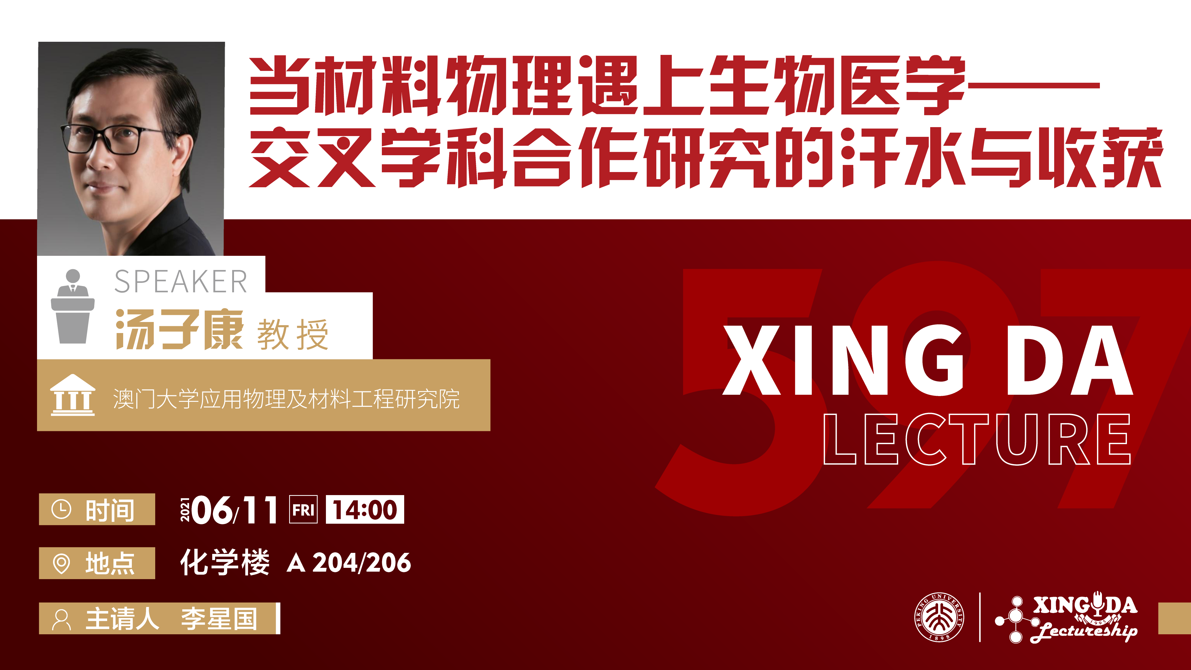 时 间:2021年6月11日(星期五)下午2:00 地 点:化学楼A204/206 主请人:李星国