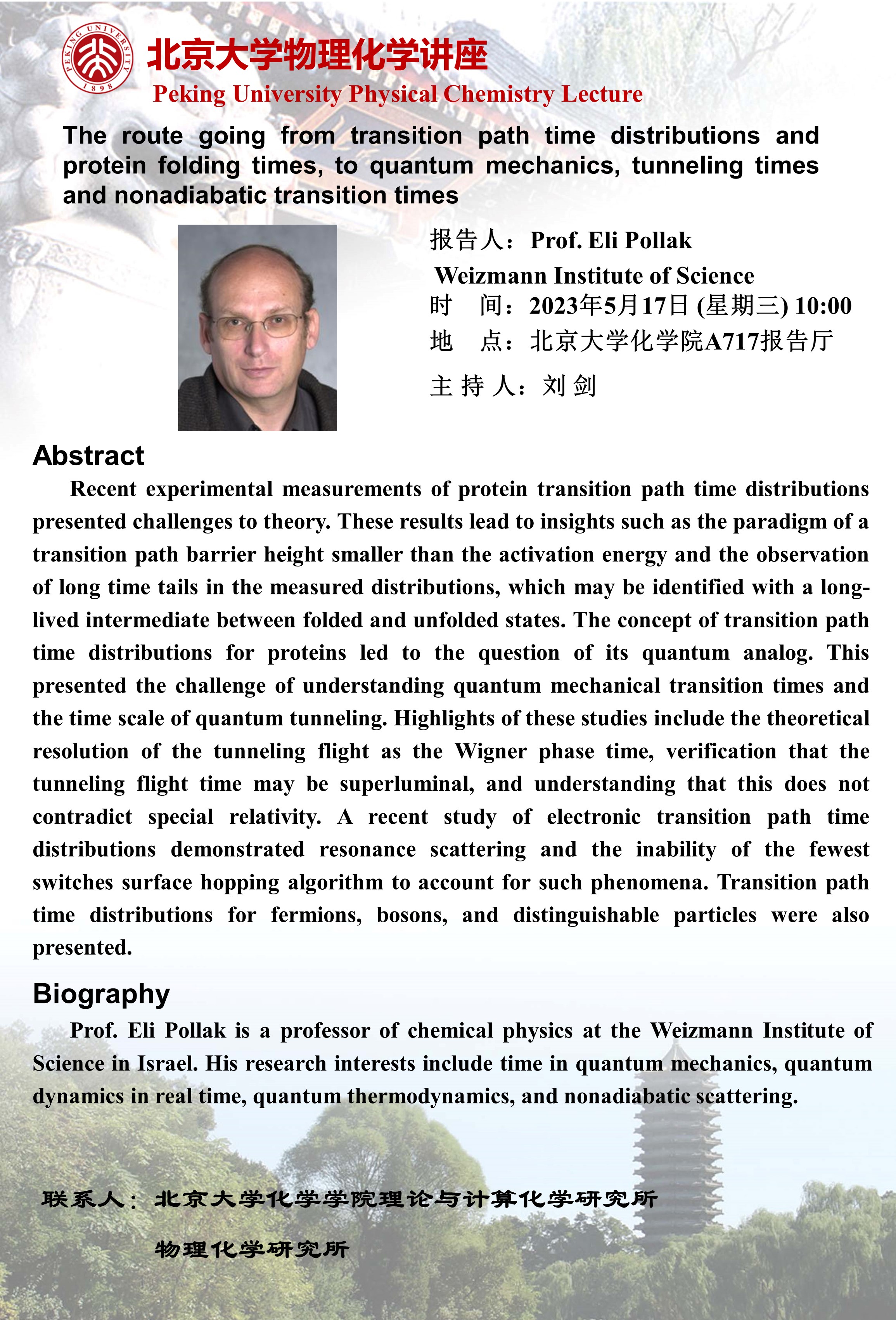 【北京大学物理化学讲座】The route going from transition path time distributions and protein folding times, to quantum mechanics, tunneling times and nonadiabatic transition times