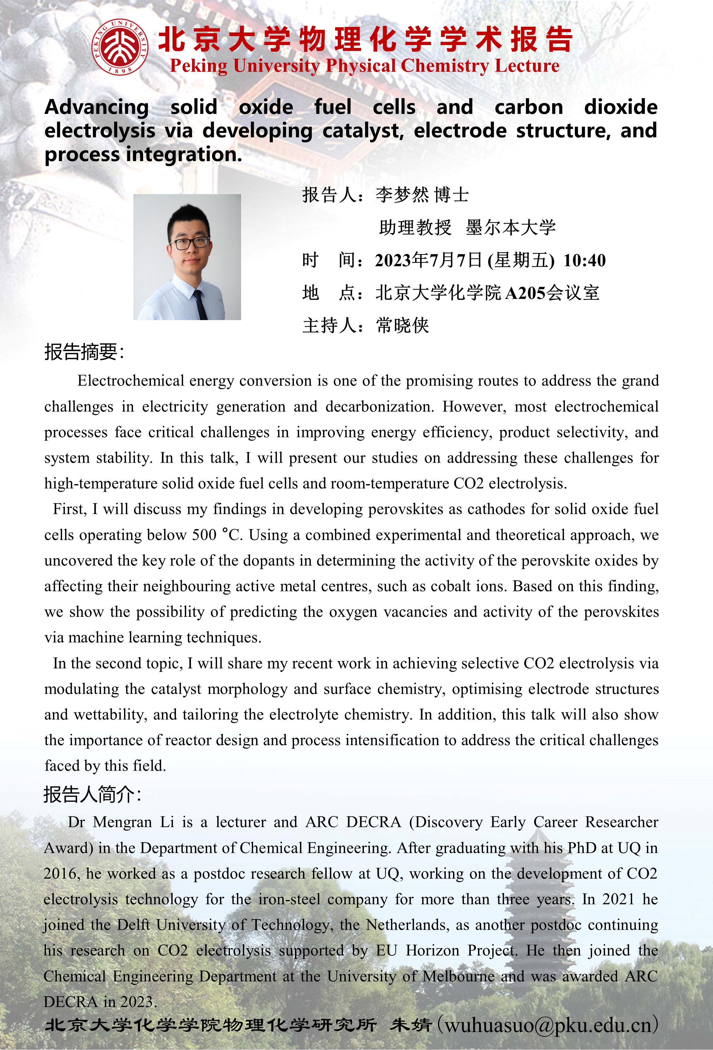【北京大学物理化学学术报告】Advancing solid oxide fuel cells and carbon dioxide electrolysis via developing catalyst, electrode structure, and process integration.