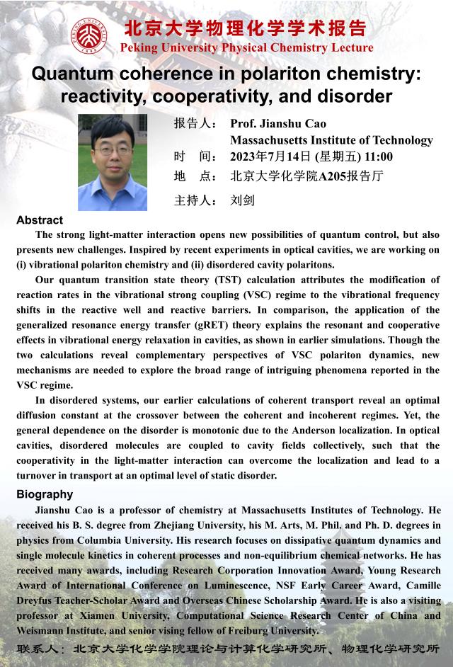 【北京大学物理化学学术报告】Quantum coherence in polariton chemistry: reactivity, cooperativity, and disorder