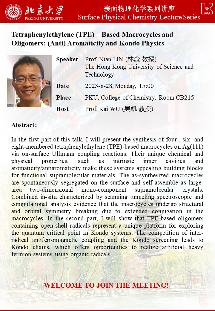 【表面物理化学系列讲座】Tetraphenylethylene (TPE) – Based Macrocycles and Oligomers: (Anti) Aromaticity and Kondo Physics