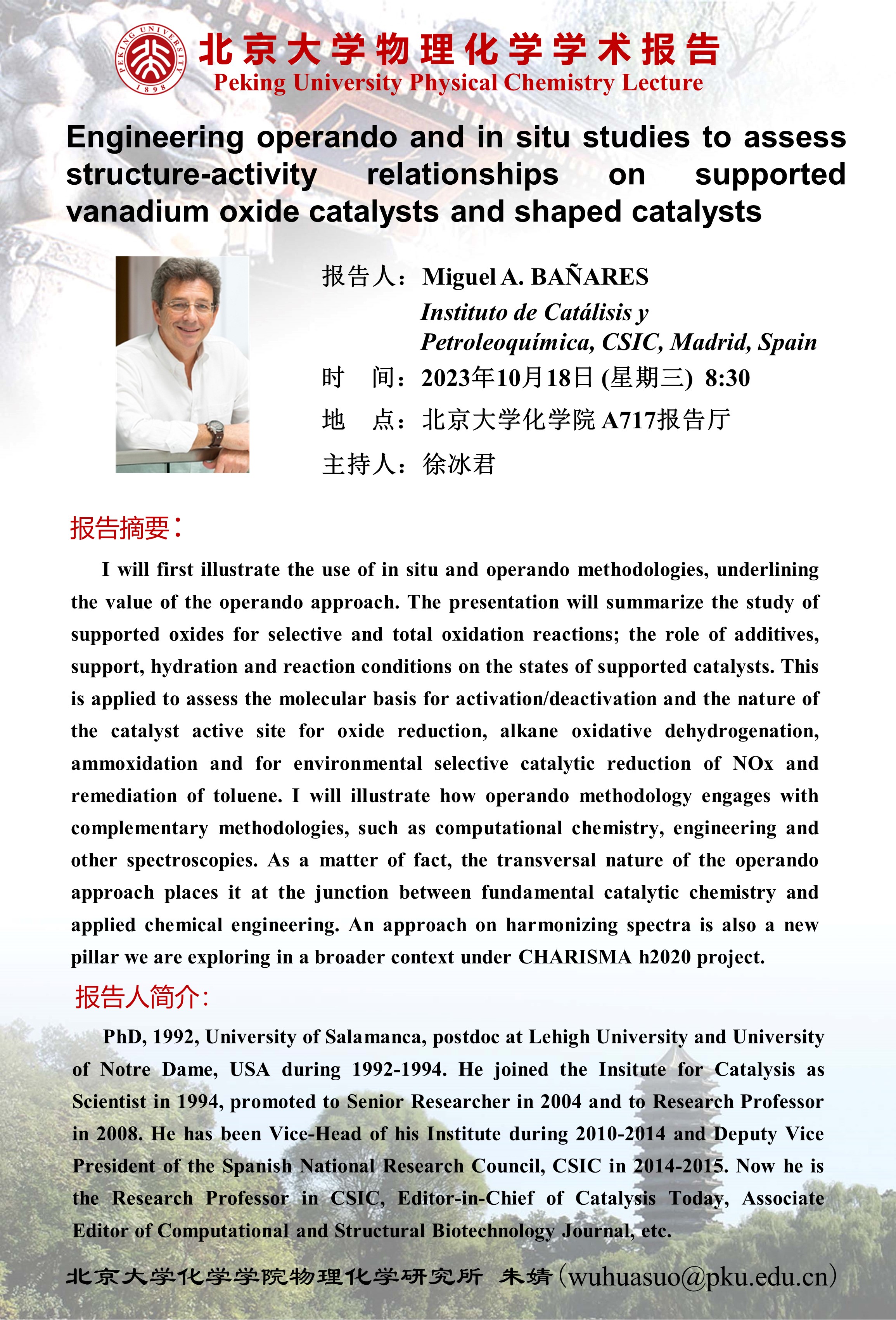 【北京大学物理化学学术报告】Engineering operando and in situ studies to assess structure-activity relationships on supported vanadium oxide catalysts and shaped catalysts