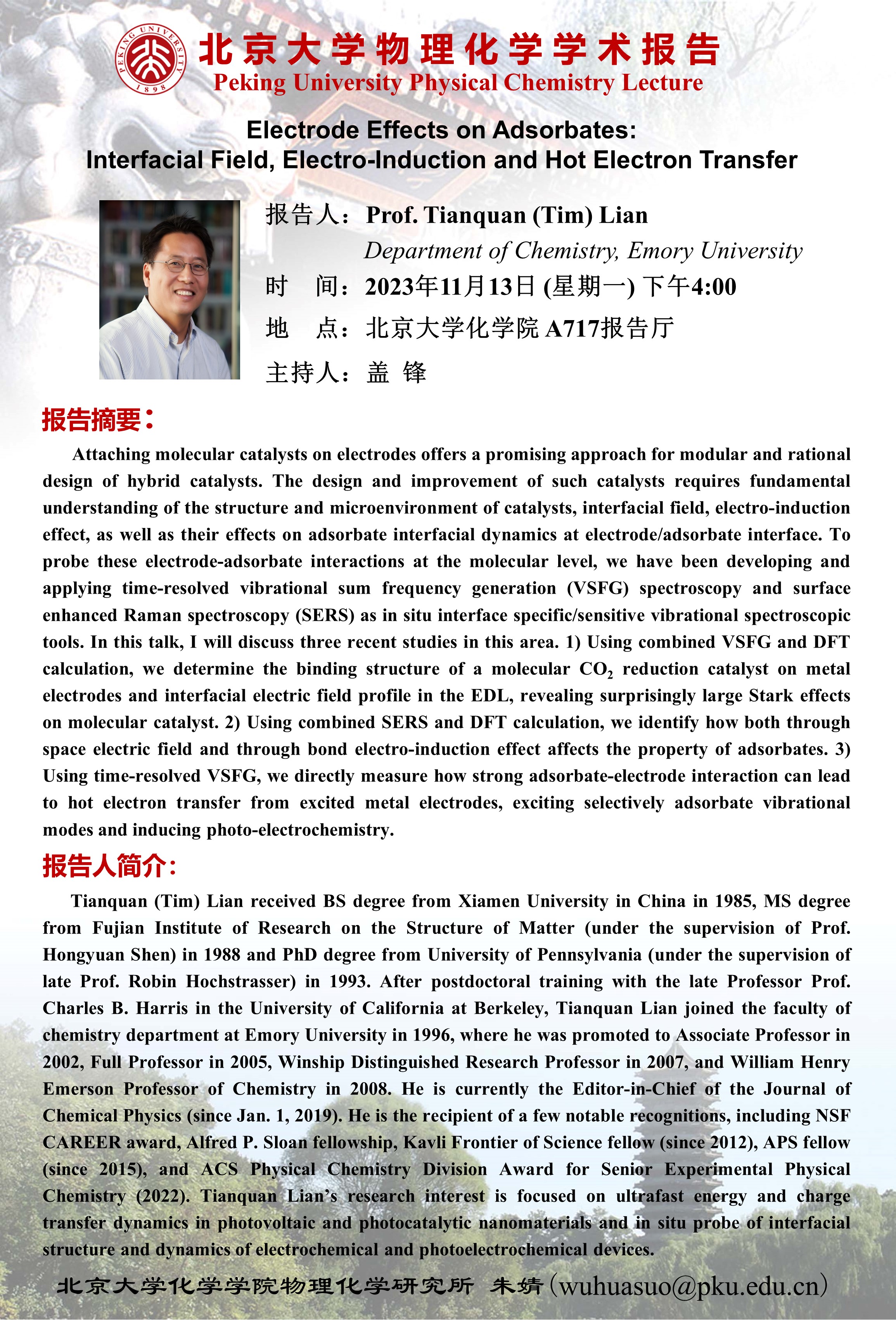 【北京大学物理化学学术报告】Electrode Effects on Adsorbates: Interfacial Field, Electro-Induction and Hot Electron Transfer