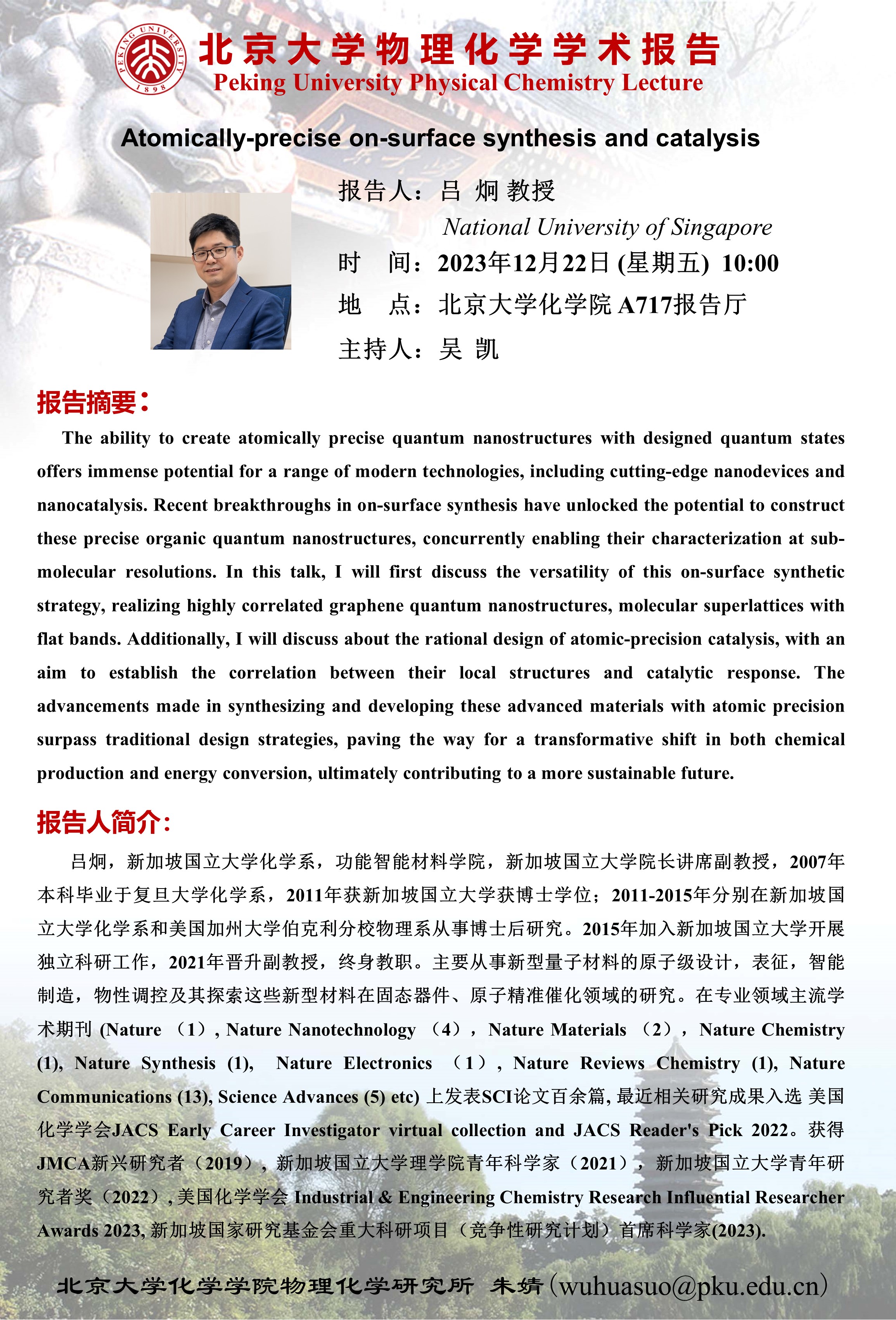 【北京大学物理化学学术报告】Atomically-precise on-surface synthesis and catalysis